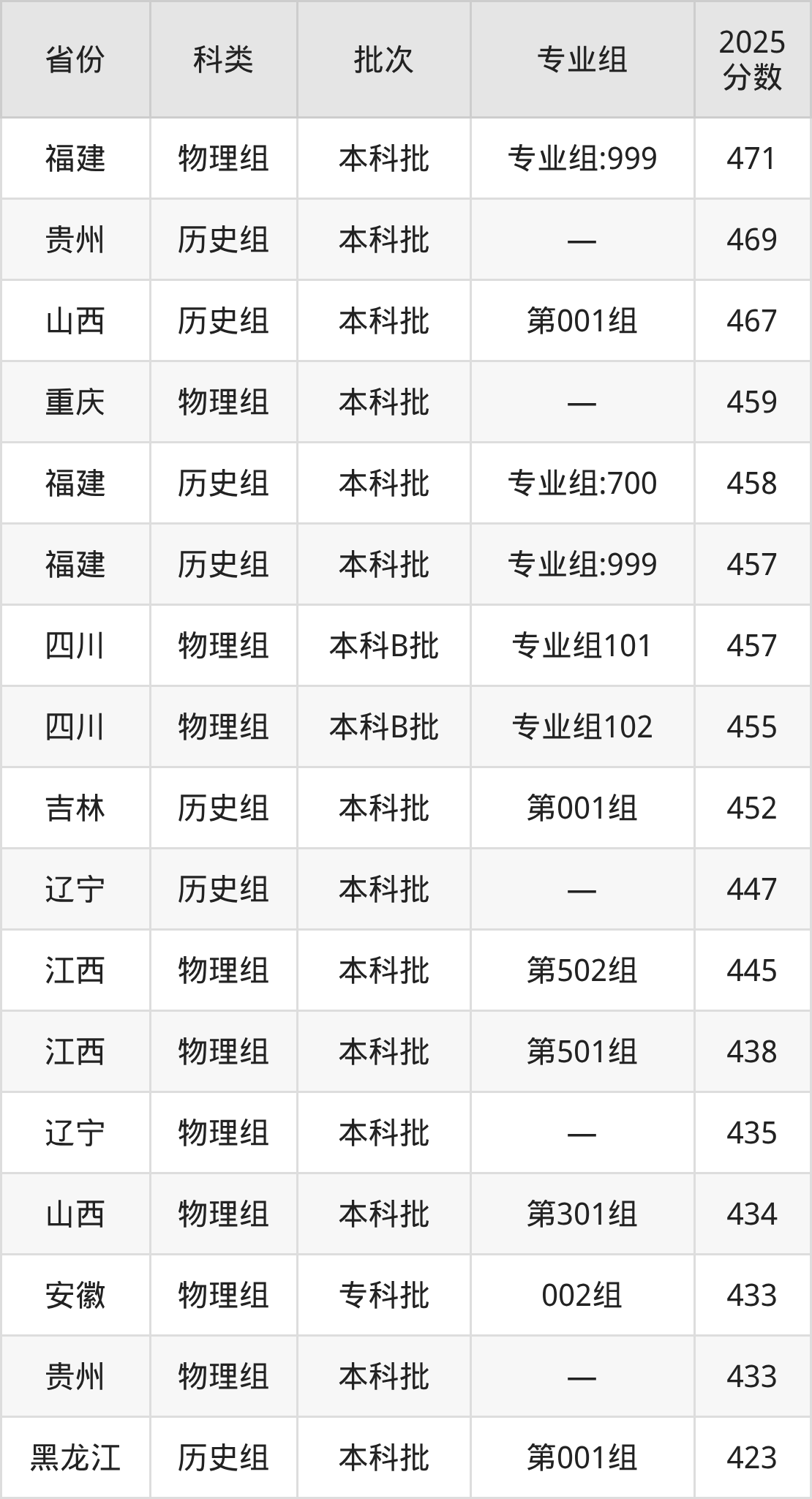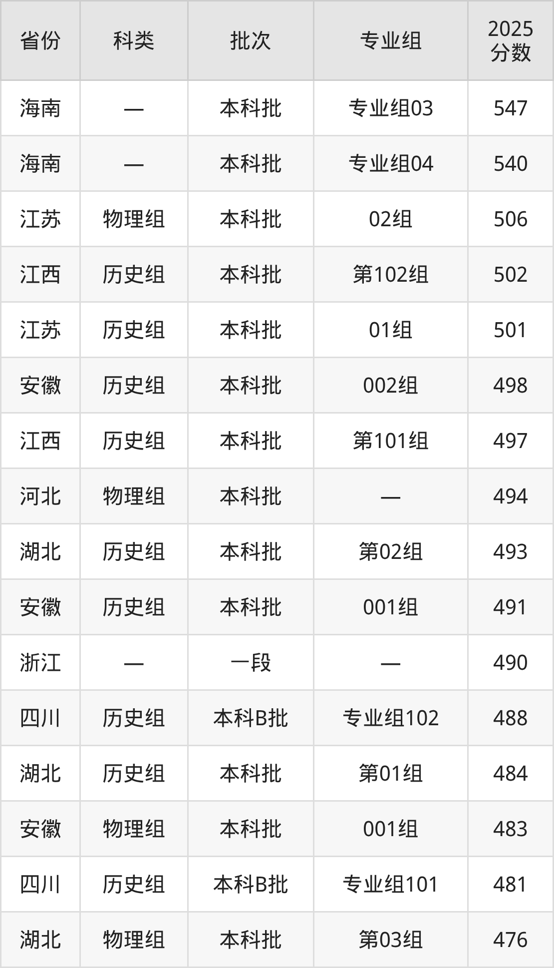 2025年景德镇艺术职业大学在全国普通批次招生的录取分数范围位于180~547分之间,其中省内分数范围为240分~502分,历史组最低分专业组为“第103组”,考生346分即可报考,物理组最低分专业组为“第503组”,考生240分即可报考。
