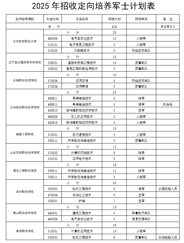 2025年在内蒙古招生的定向士官院校共计27所,包括威海职业学院、潍坊工程职业学院、武昌职业学院等,完整名单如下: