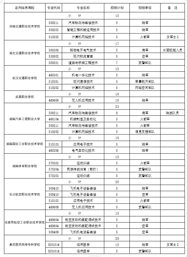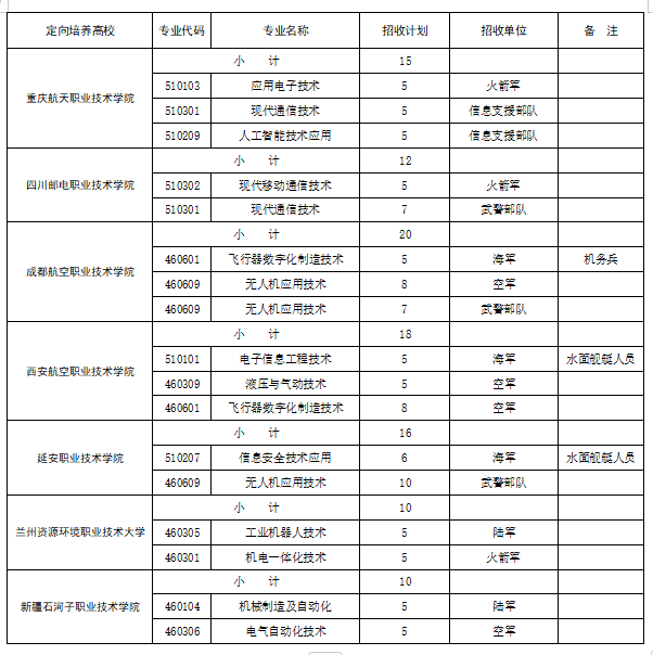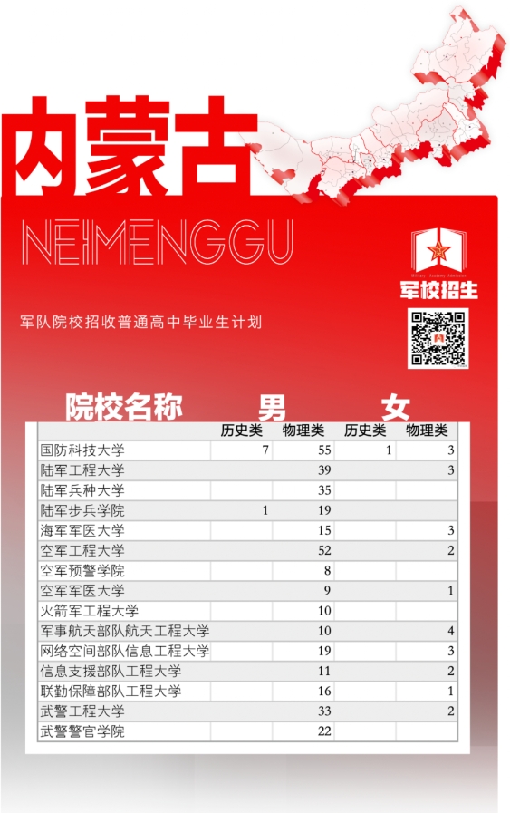 2025年在内蒙古招生的军校共计15所,包括国防科技大学、陆军工程大学、海军军医大学、空军工程大学等,完整名单及招生计划见下。