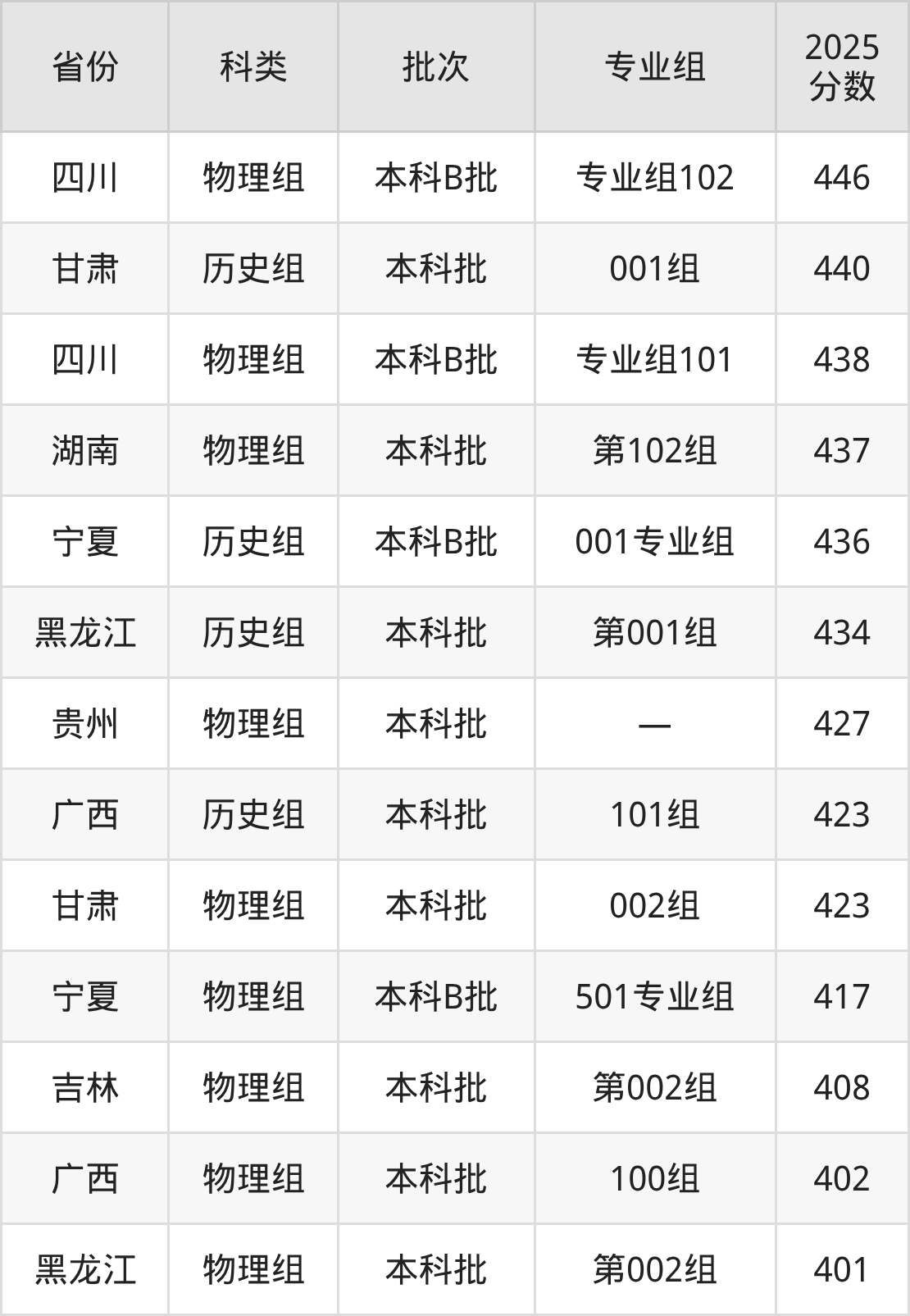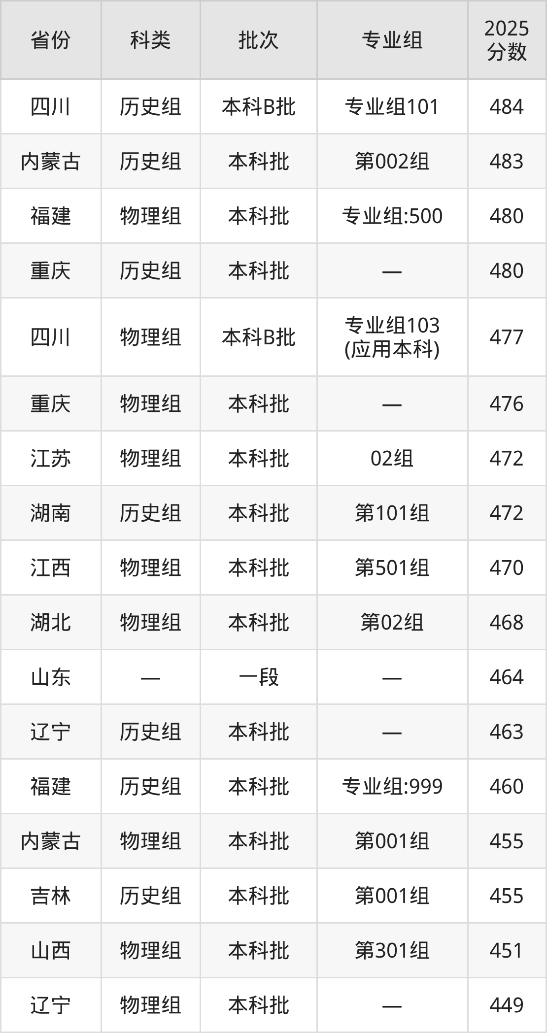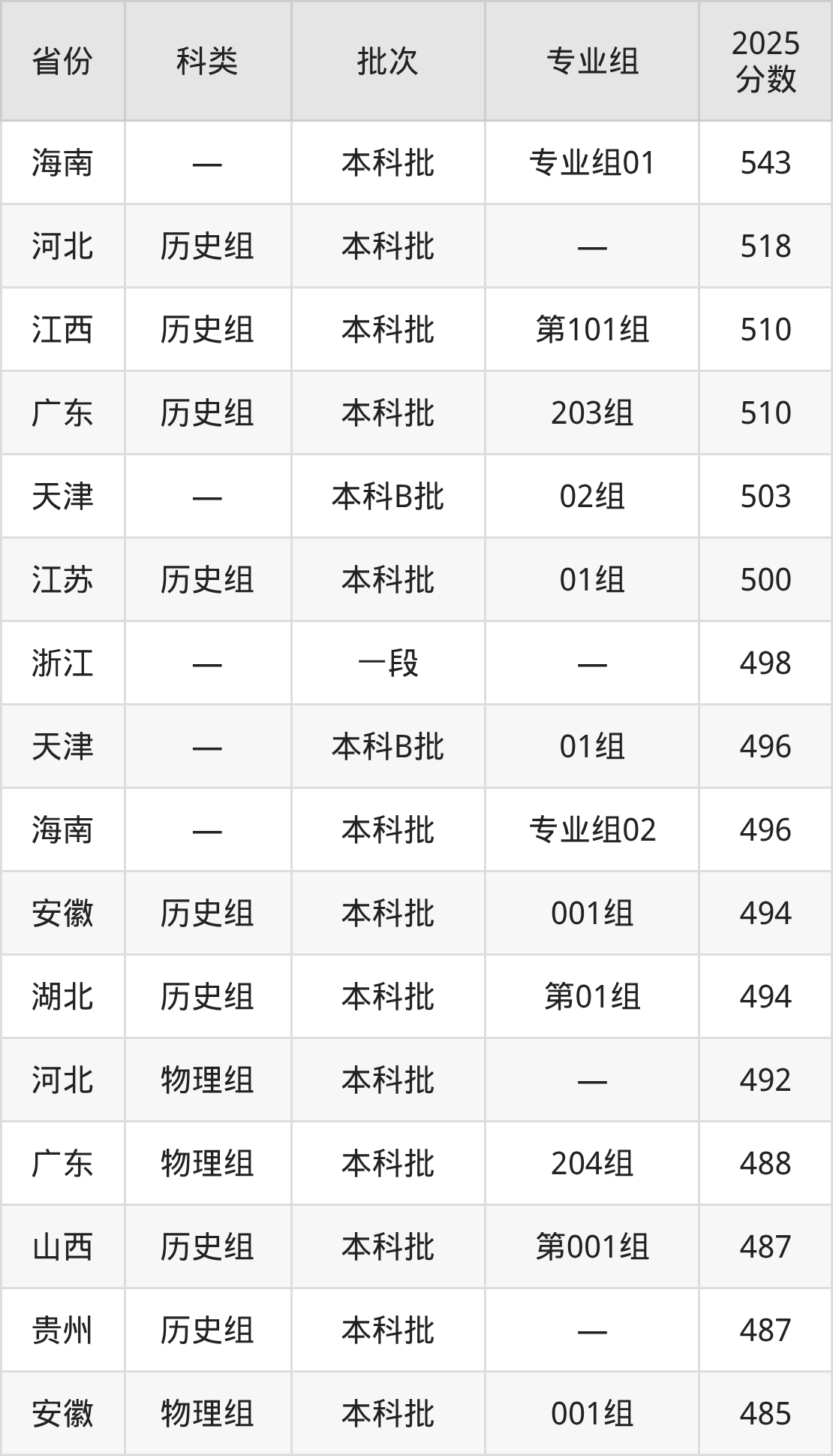 2025年成都理工大学工程技术学院在全国普通批次招生的录取分数范围位于401~543分之间,其中省内分数范围为438分~484分,历史组最低分专业组为“专业组101”,考生484分即可报考,物理组最低分专业组为“专业组101”,考生438分即可报考。