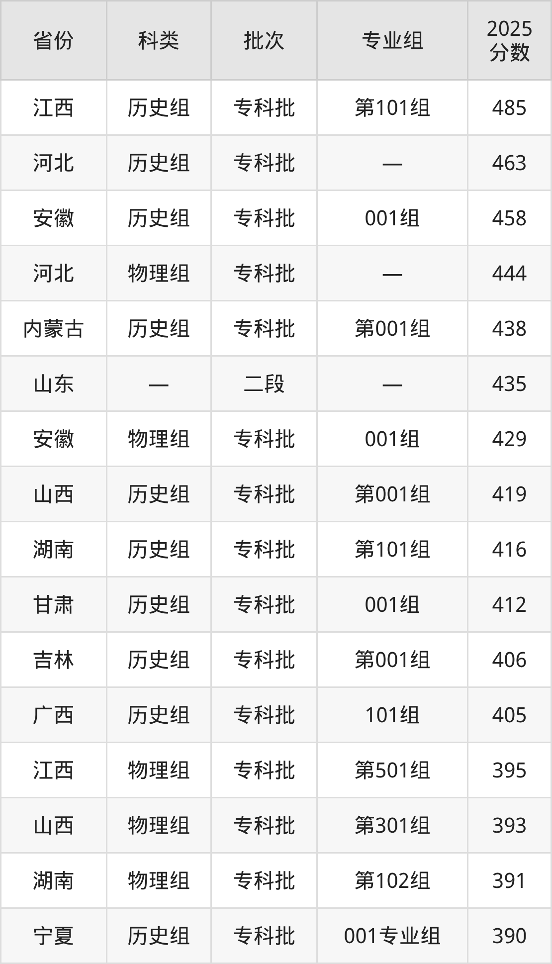 而江西地区历史组考生的分数门槛最高,2025年南阳医学高等专科学校第101组在江西招生最低分为485分,考生至少要超专科线195分才有可能被录取。