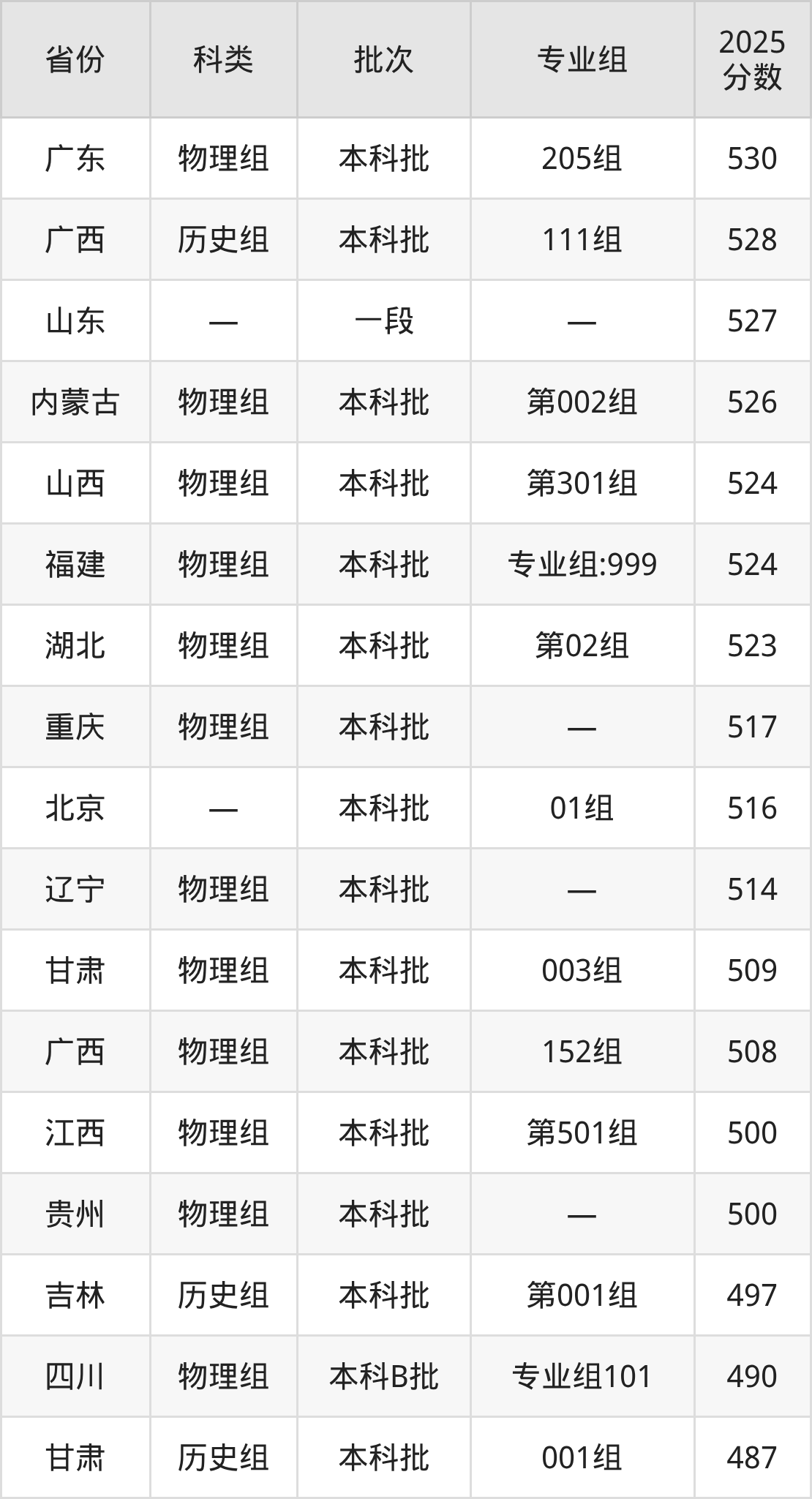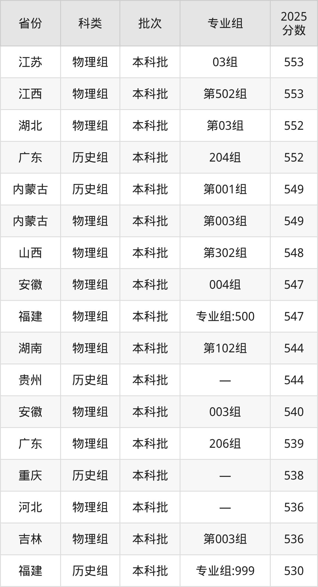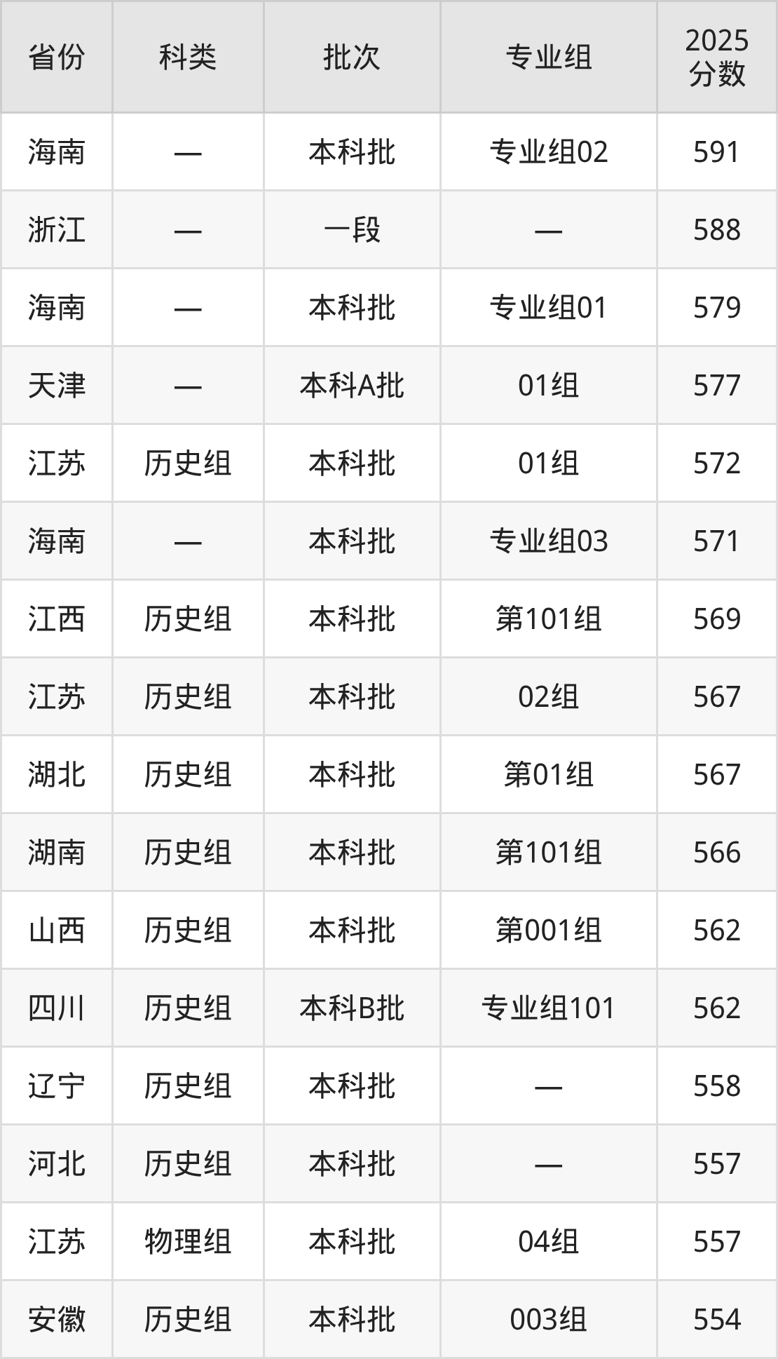 2025年安徽财经大学在全国普通批次招生的录取分数范围位于378~591分之间,其中省内分数范围为540分~554分,历史组最低分专业组为“003组”,考生554分即可报考,物理组最低分专业组为“003组”,考生540分即可报考。