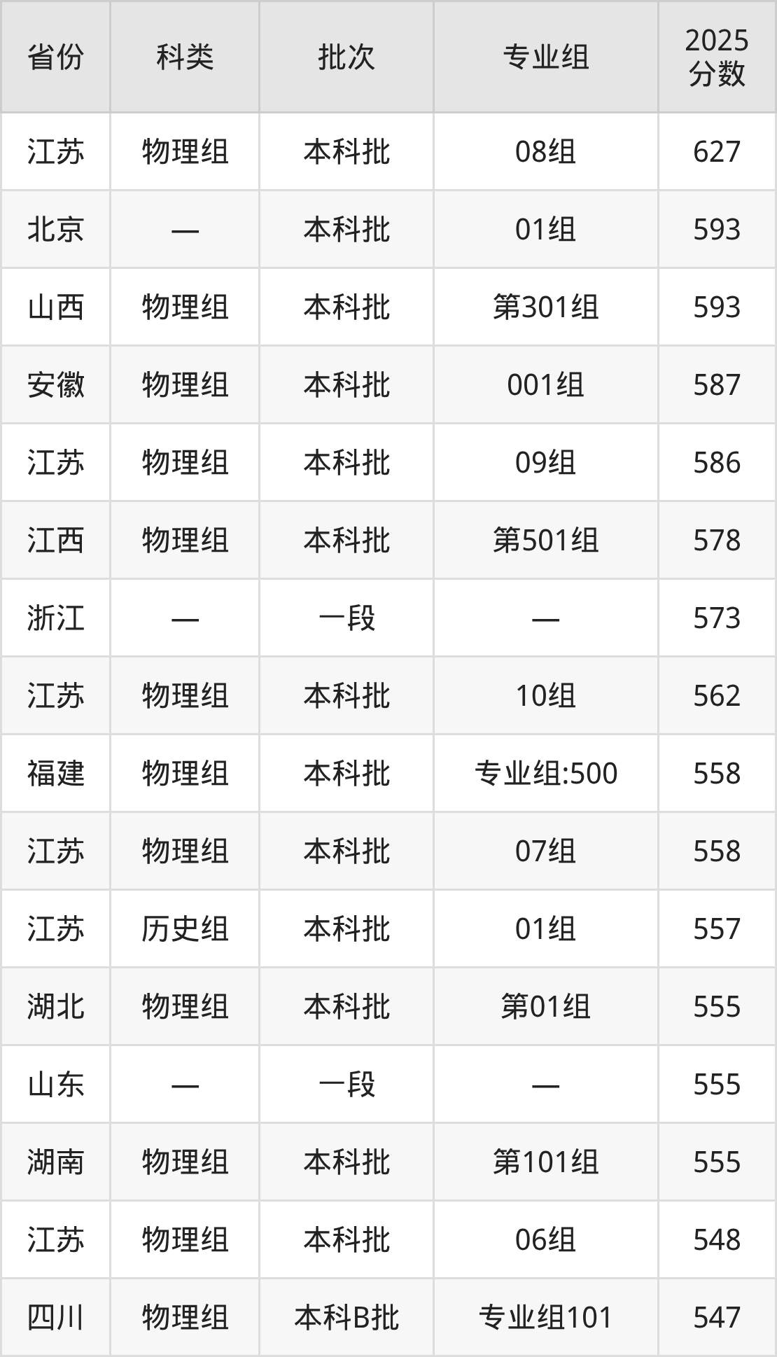 2025年徐州医科大学在全国普通批次招生的录取分数范围位于501~627分之间,其中省内分数范围为539分~627分,历史组最低分专业组为“01组”,考生557分即可报考,物理组最低分专业组为“04组”,考生539分即可报考。