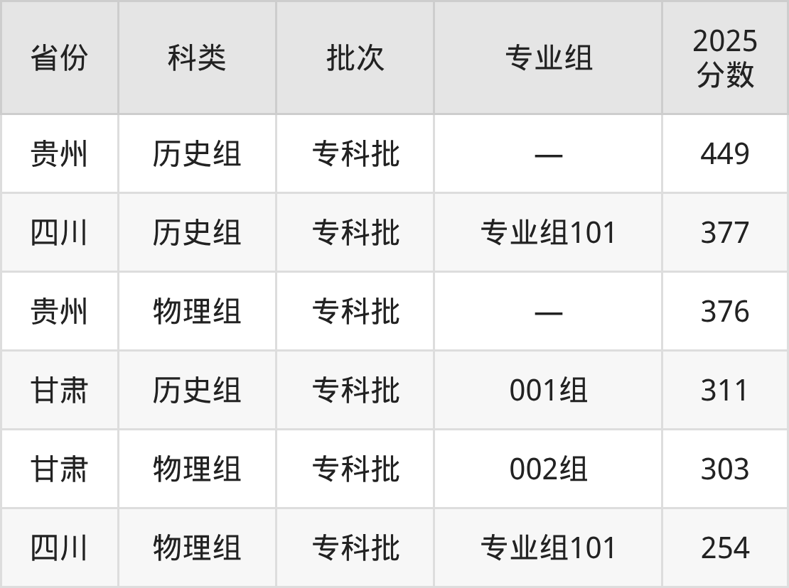 而贵州地区历史组考生的分数门槛最高,2025年阿坝职业学院在贵州招生最低分为449分,考生至少要超专科线269分才有可能被录取。