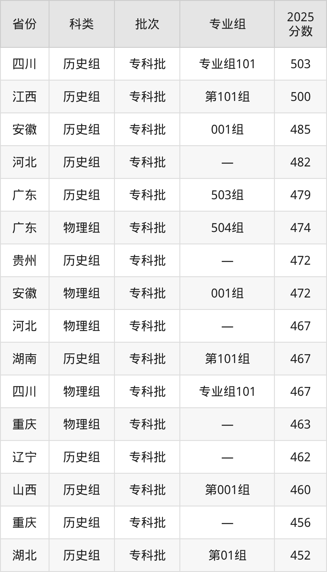而四川地区历史组考生的分数门槛最高,2025年武汉电力职业技术学院专业组101在四川招生最低分为503分,考生至少要超专科线353分才有可能被录取。