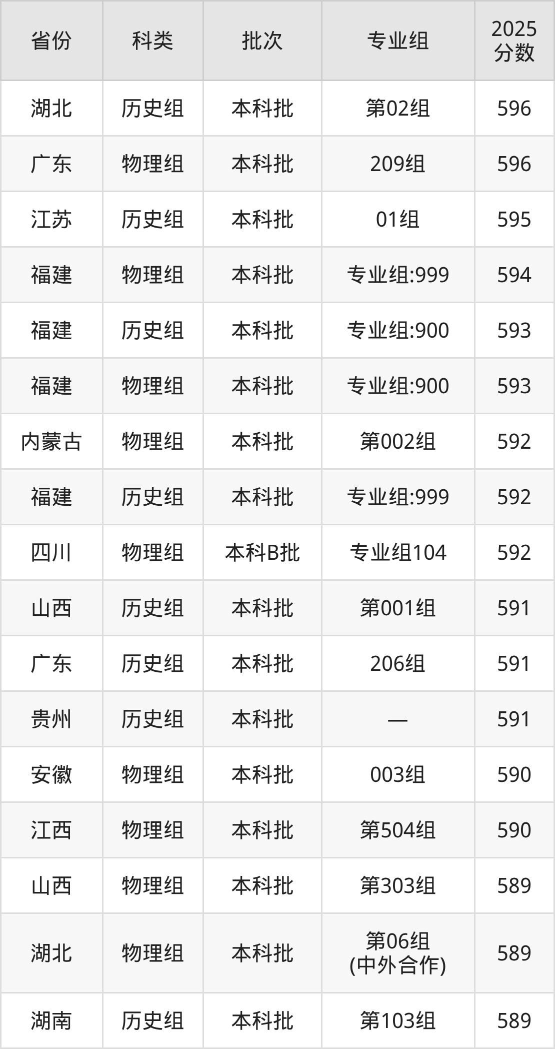 2025年福州大学在全国普通批次招生的录取分数范围位于372~658分之间,其中省内分数范围为592分~616分,物理组最低分专业组为“专业组:900”,考生593分即可报考,历史组最低分专业组为“专业组:999”,考生592分即可报考。