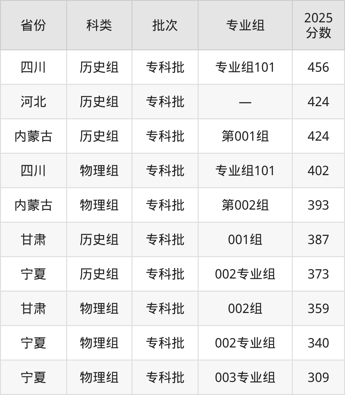 而四川地区历史组考生的分数门槛最高,2025年宁夏警官职业学院专业组101在四川招生最低分为456分,考生至少要超专科线306分才有可能被录取。