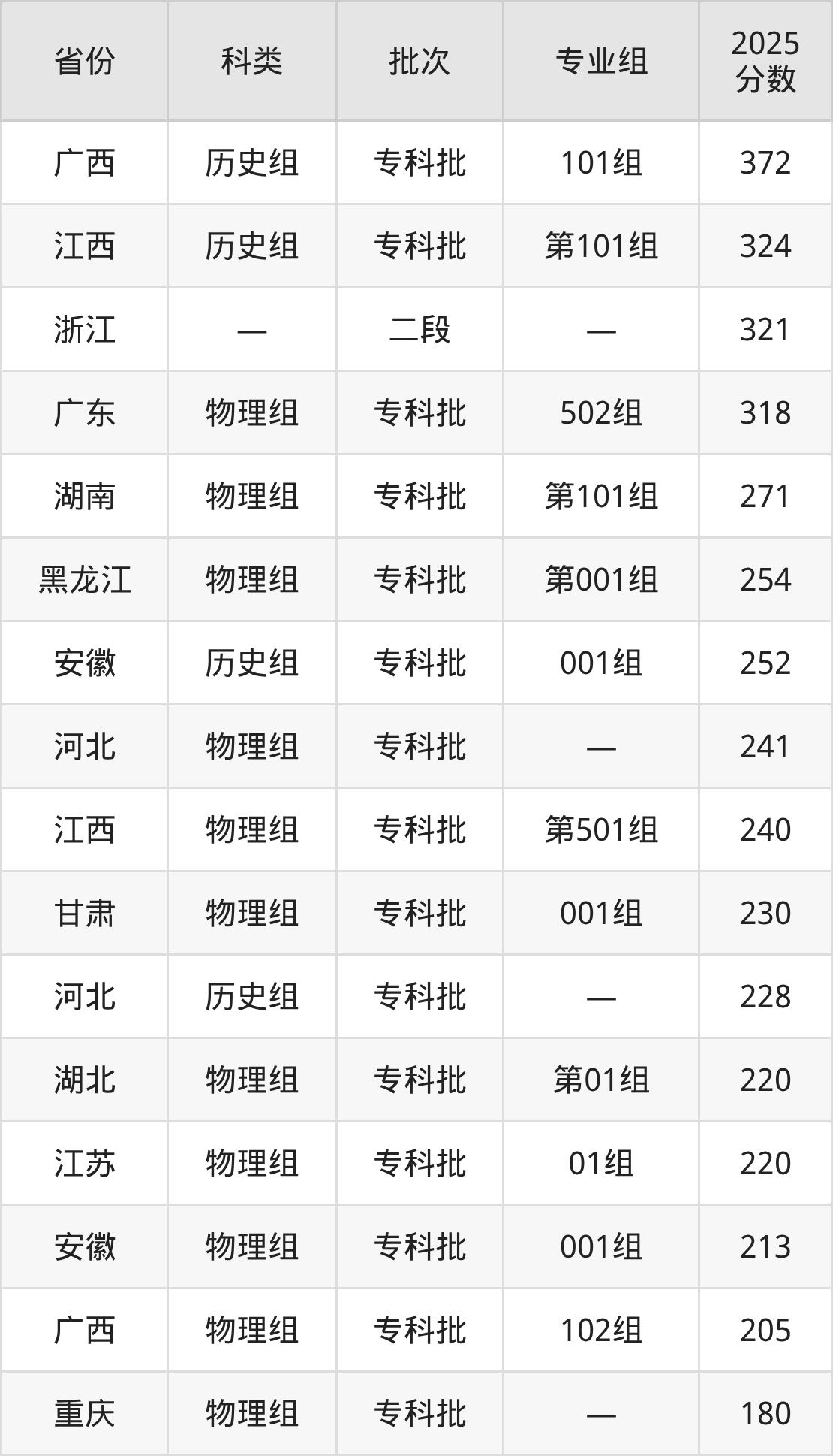 而广西地区历史组考生的分数门槛最高,2025年武夷山职业学院101组在广西招生最低分为372分,考生至少要超专科线172分才有可能被录取。