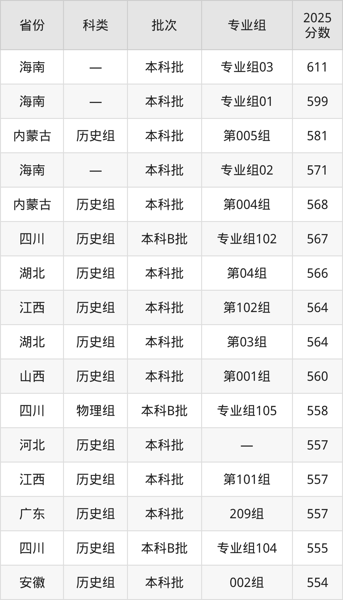 而海南地区考生的分数门槛最高,2025年西南科技大学专业组03在海南招生最低分为611分,考生至少要超本科线131分才有可能被录取。