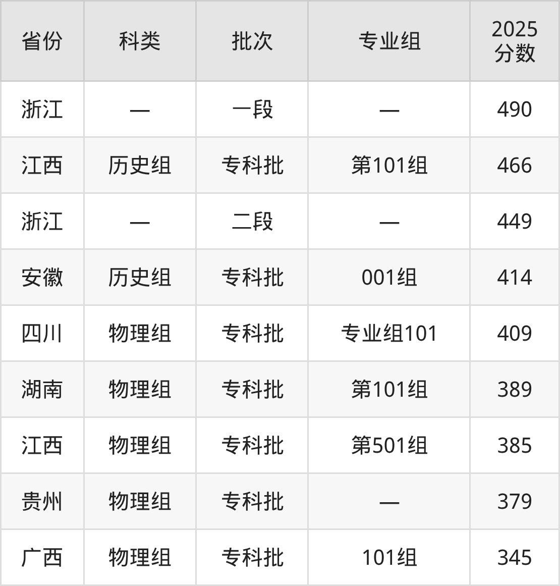 而江西地区历史组考生的分数门槛最高,2025年衢州职业技术学院第101组在江西招生最低分为466分,考生至少要超专科线176分才有可能被录取。