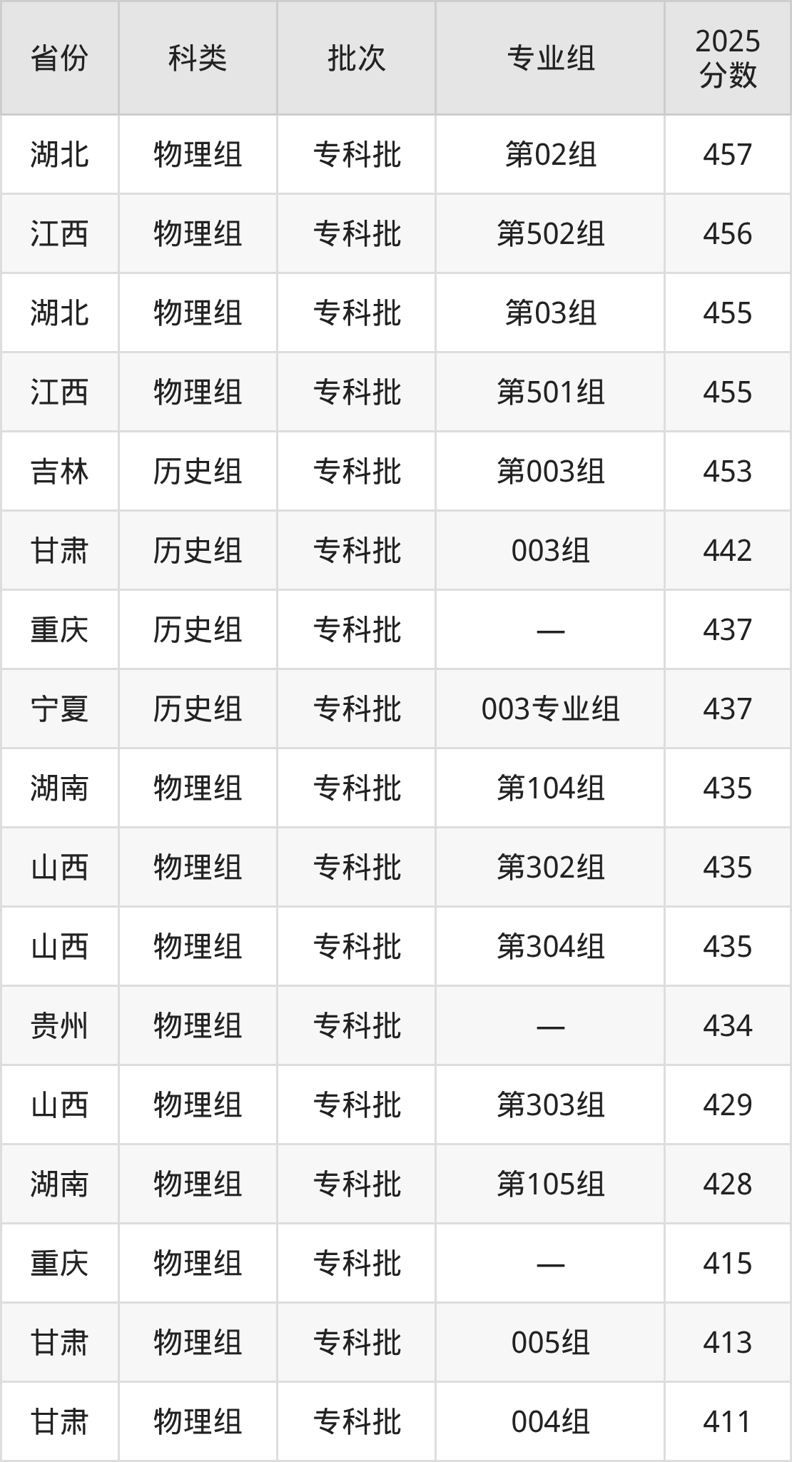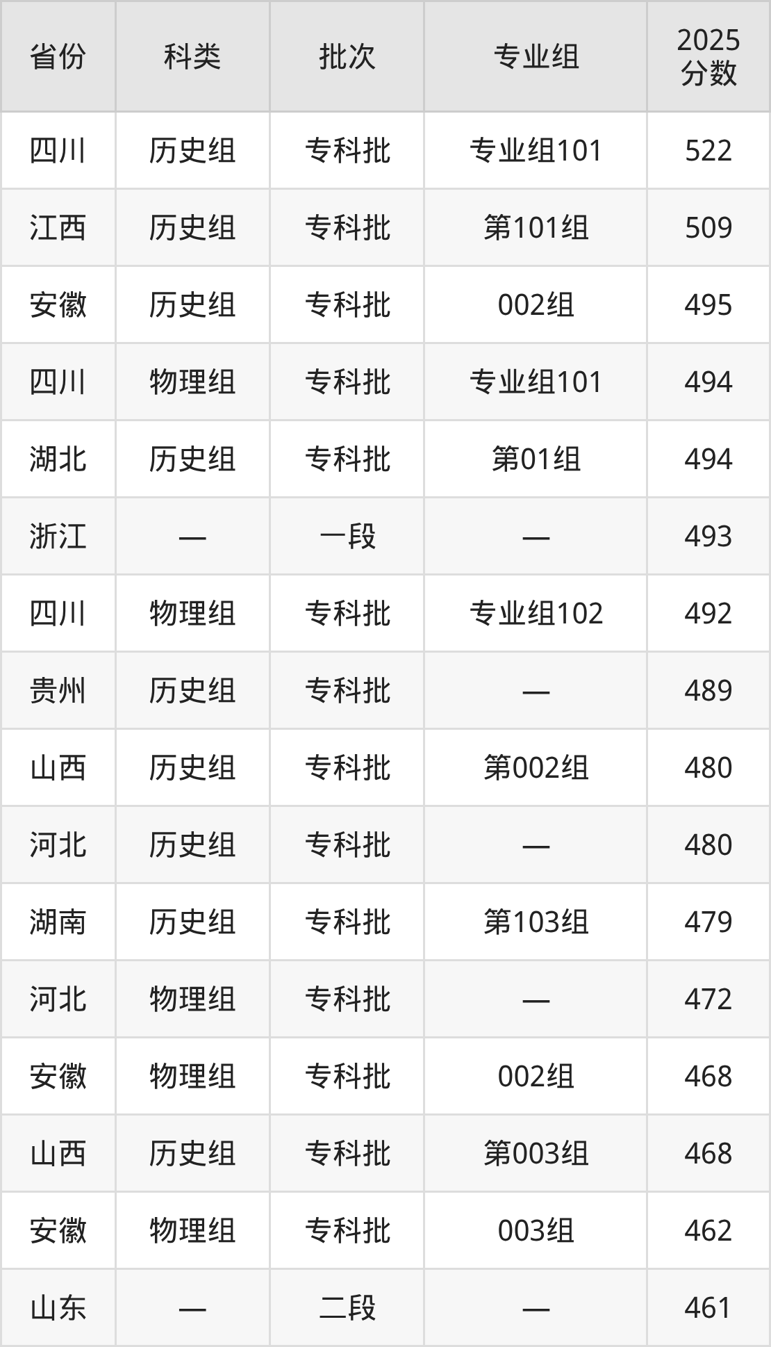 下面是重庆医药高等专科学校2025年在全国各省的录取分数线一览表,供参考: