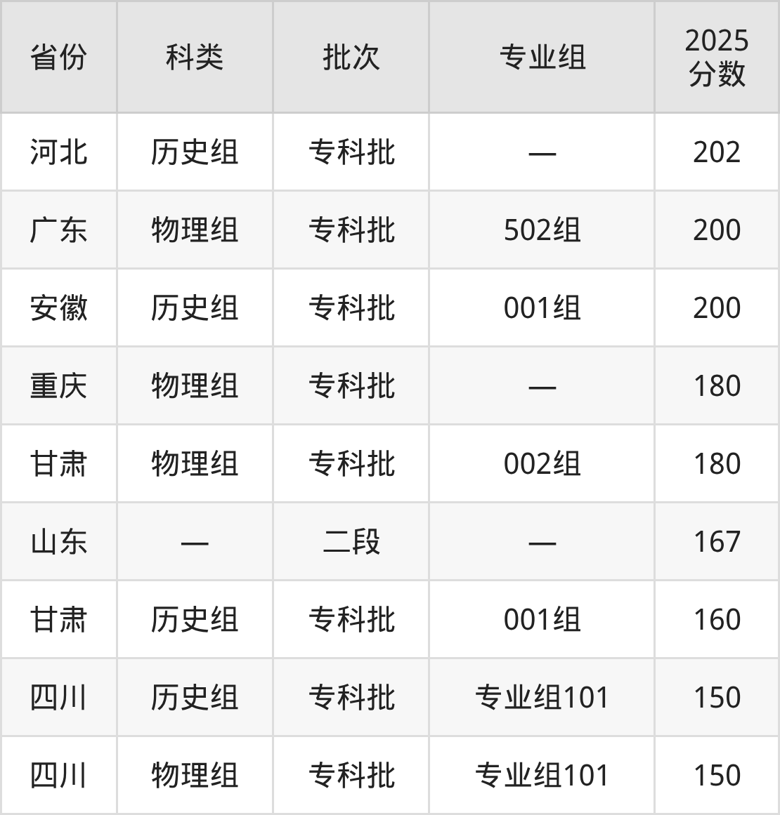 广东亚视演艺职业学院在省外招生的最低分为150分,其中四川地区历史组考生上广东亚视演艺职业学院的分数门槛最低,考生成绩达专科线即可报考。其次是甘肃历史组考生,上广东亚视演艺职业学院至少要超专科线0分(160分)。