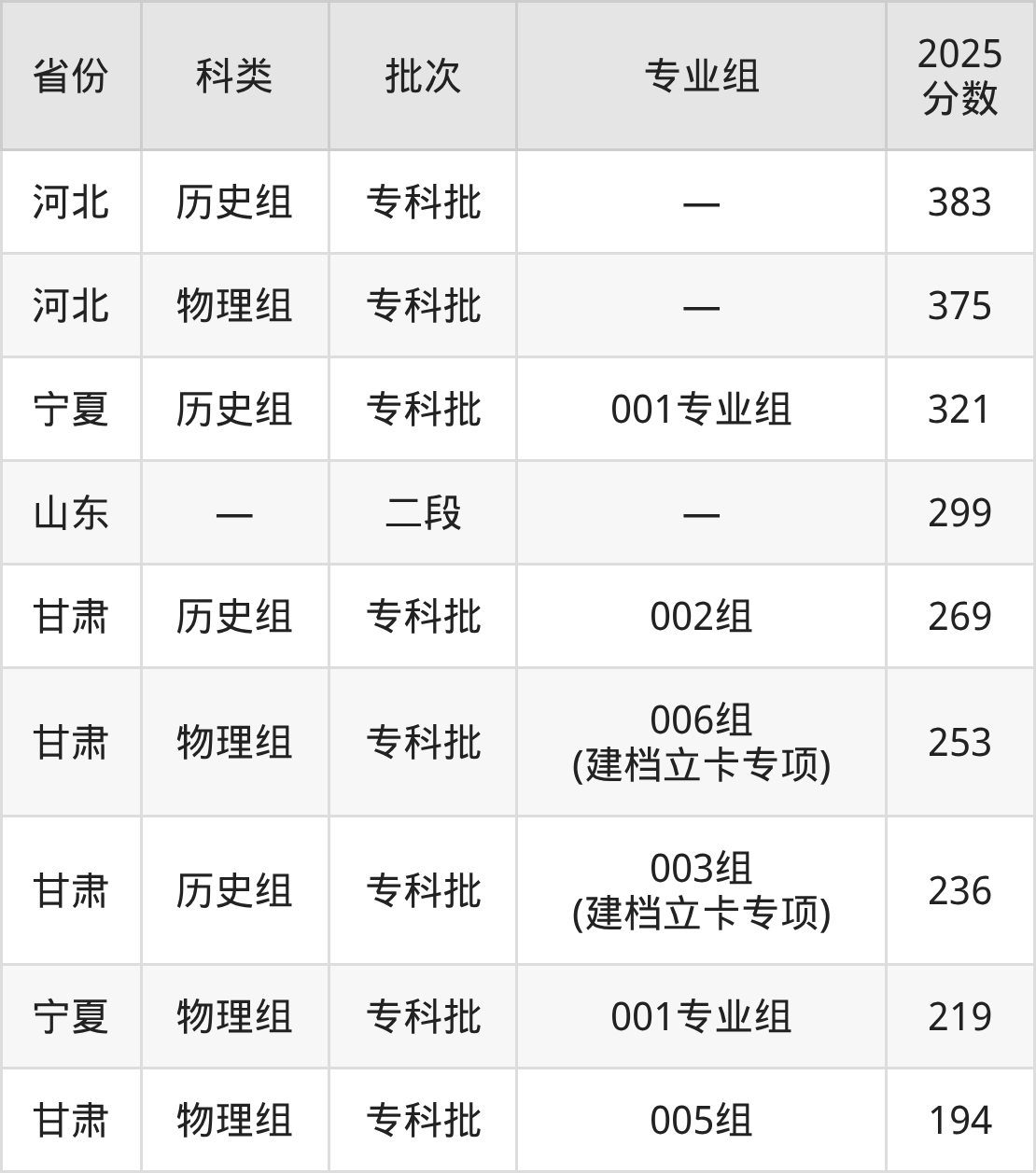 而河北地区历史组考生的分数门槛最高,2025年定西职业技术学院在河北招生最低分为383分,考生至少要超专科线183分才有可能被录取。