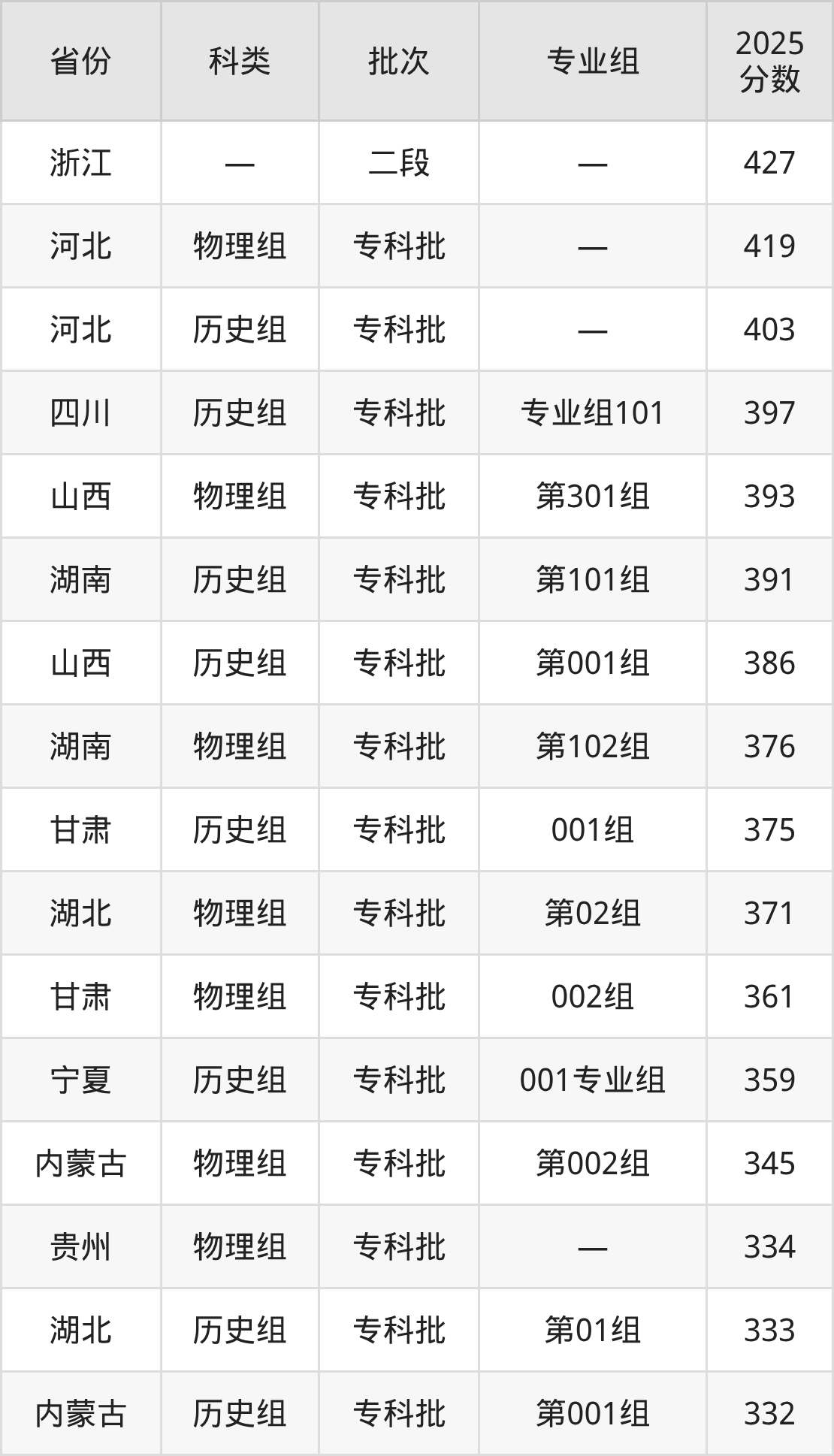 而浙江地区考生的分数门槛最高,2025年陕西职业技术学院在浙江招生最低分为427分,考生至少要超二段线159分才有可能被录取。