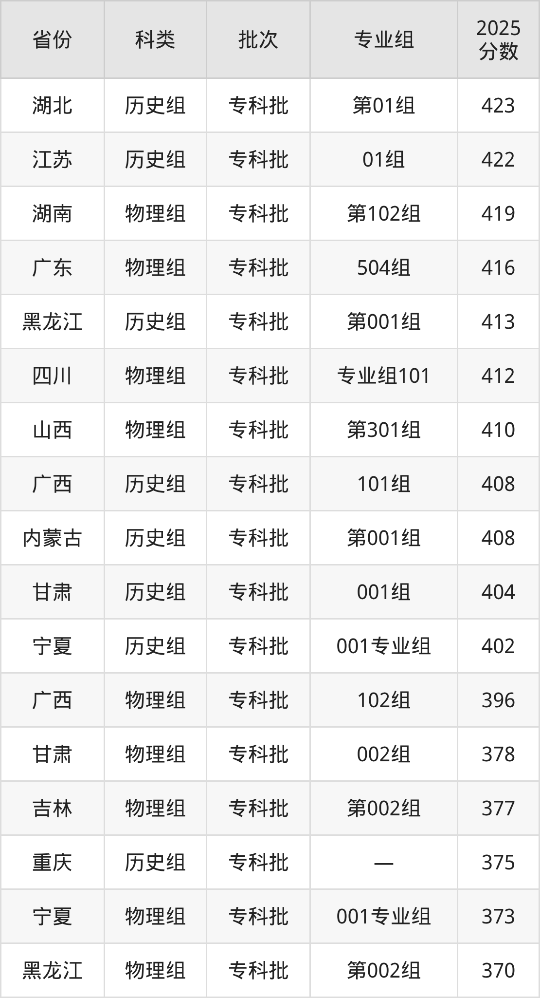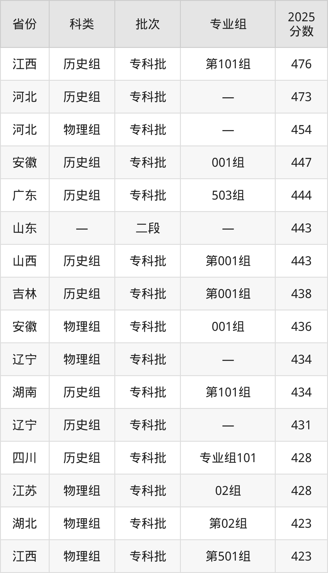 而江西地区历史组考生的分数门槛最高,2025年重庆水利电力职业技术学院第101组在江西招生最低分为476分,考生至少要超专科线186分才有可能被录取。