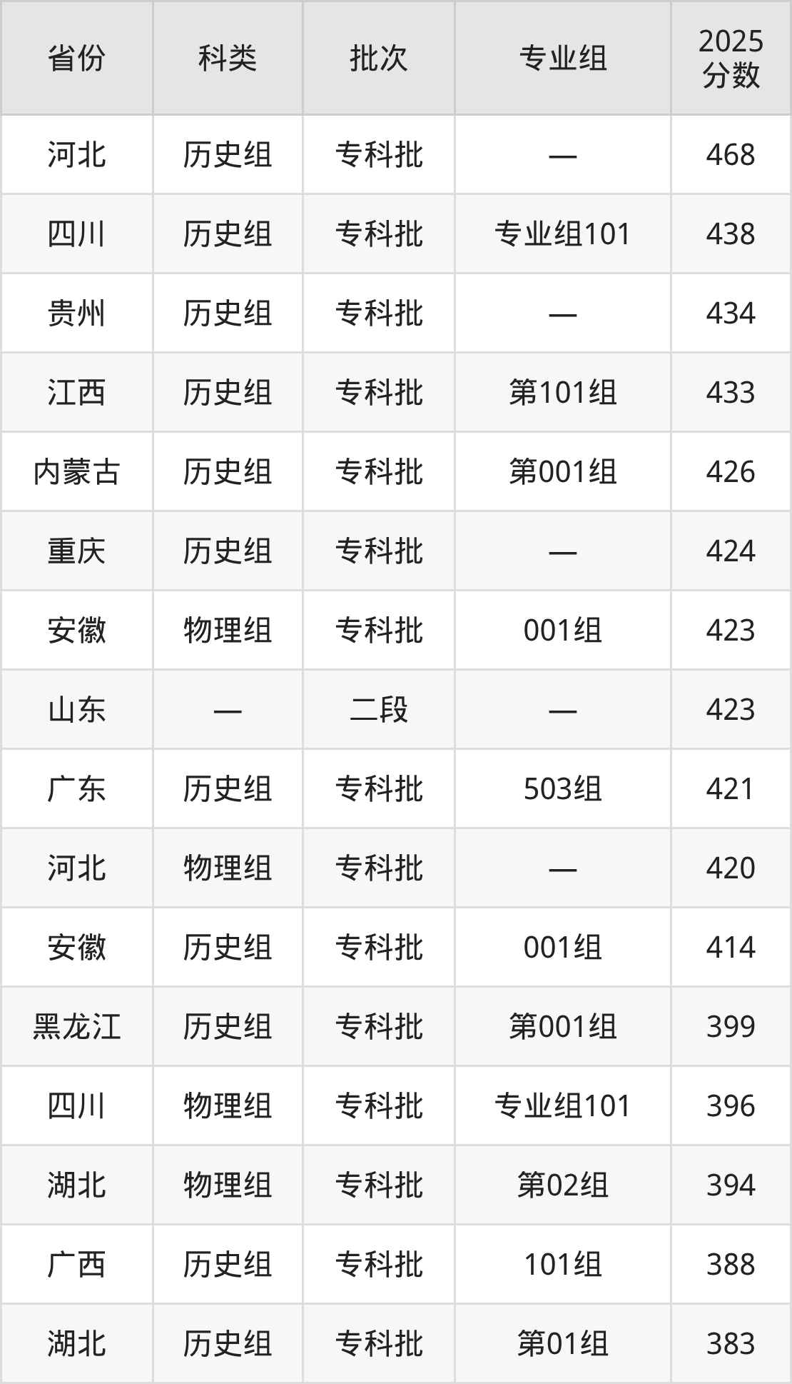 而河北地区历史组考生的分数门槛最高,2025年濮阳医学高等专科学校在河北招生最低分为468分,考生至少要超专科线268分才有可能被录取。