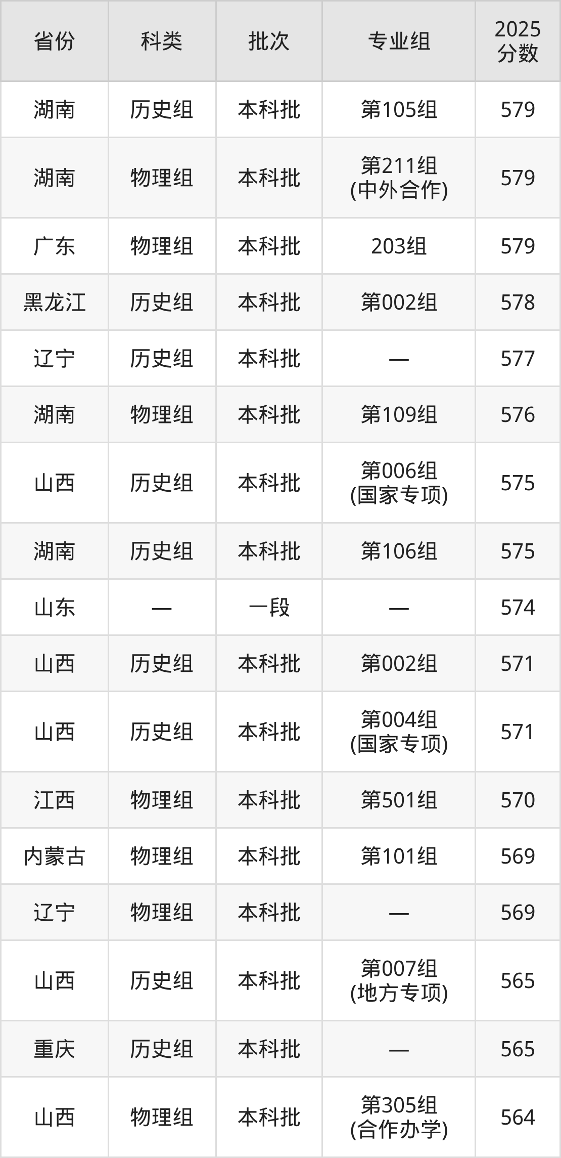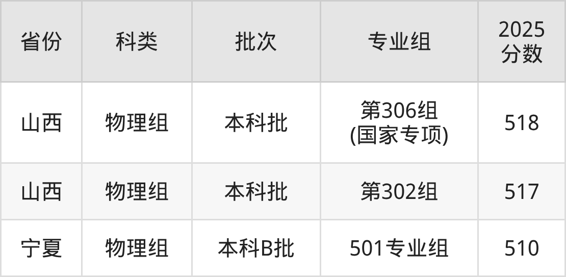 2025年太原理工大学在全国普通批次招生的录取分数范围位于510~622分之间,其中省内分数范围为517分~580分,历史组最低分专业组为“第005组(国家专项)”,考生540分即可报考,物理组最低分专业组为“第302组”,考生517分即可报考。