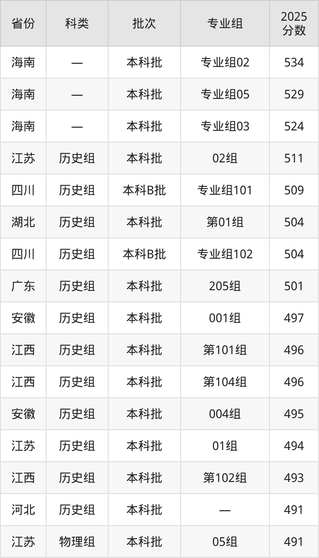 2025年南昌工学院在全国普通批次招生的录取分数范围位于183~534分之间,其中省内分数范围为240分~496分,历史组最低分专业组为“第105组”,考生339分即可报考,物理组最低分专业组为“第505组”,考生240分即可报考。