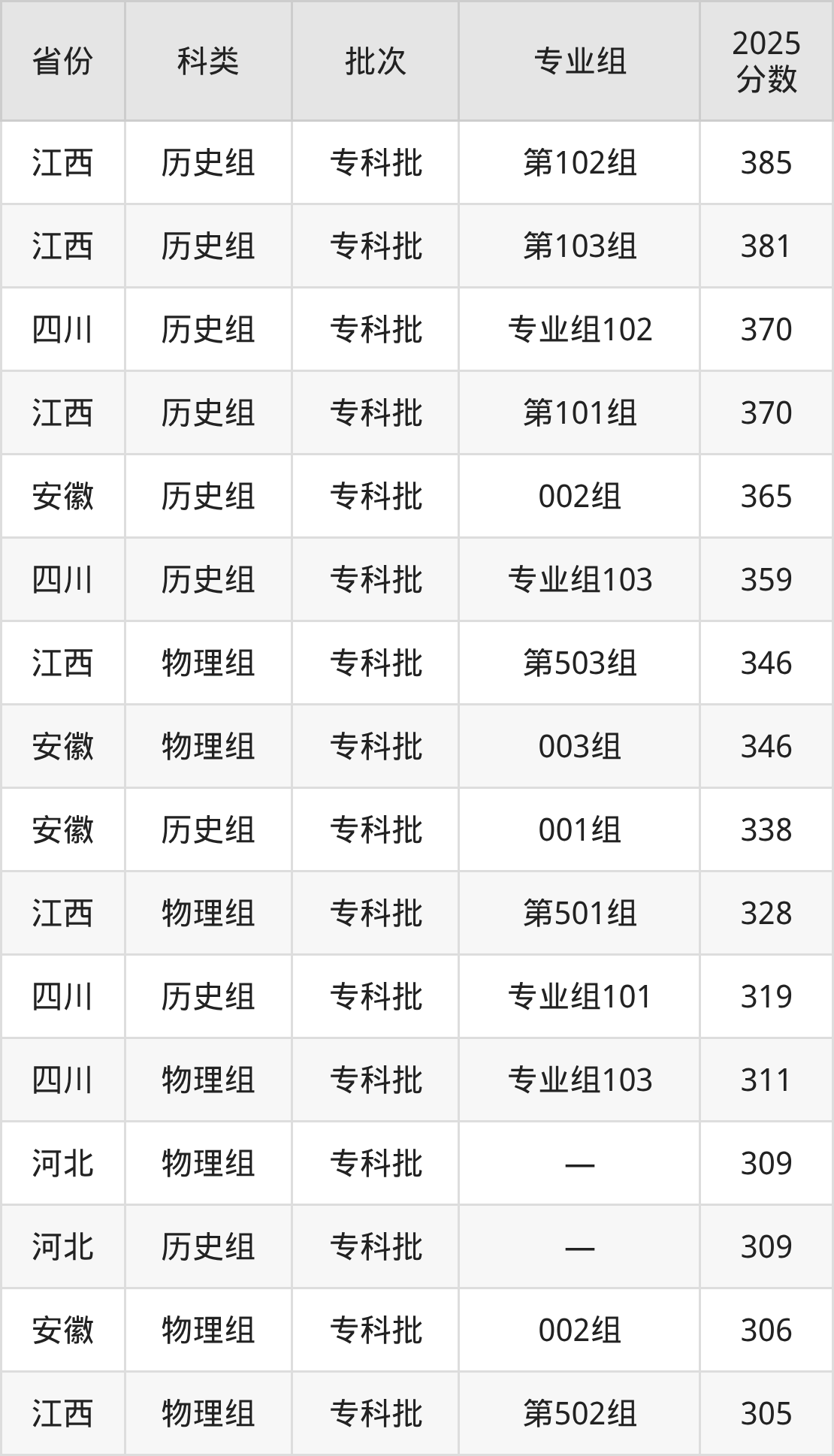 而江西地区历史组考生的分数门槛最高,2025年泉州工程职业技术学院第102组在江西招生最低分为385分,考生至少要超专科线95分才有可能被录取。