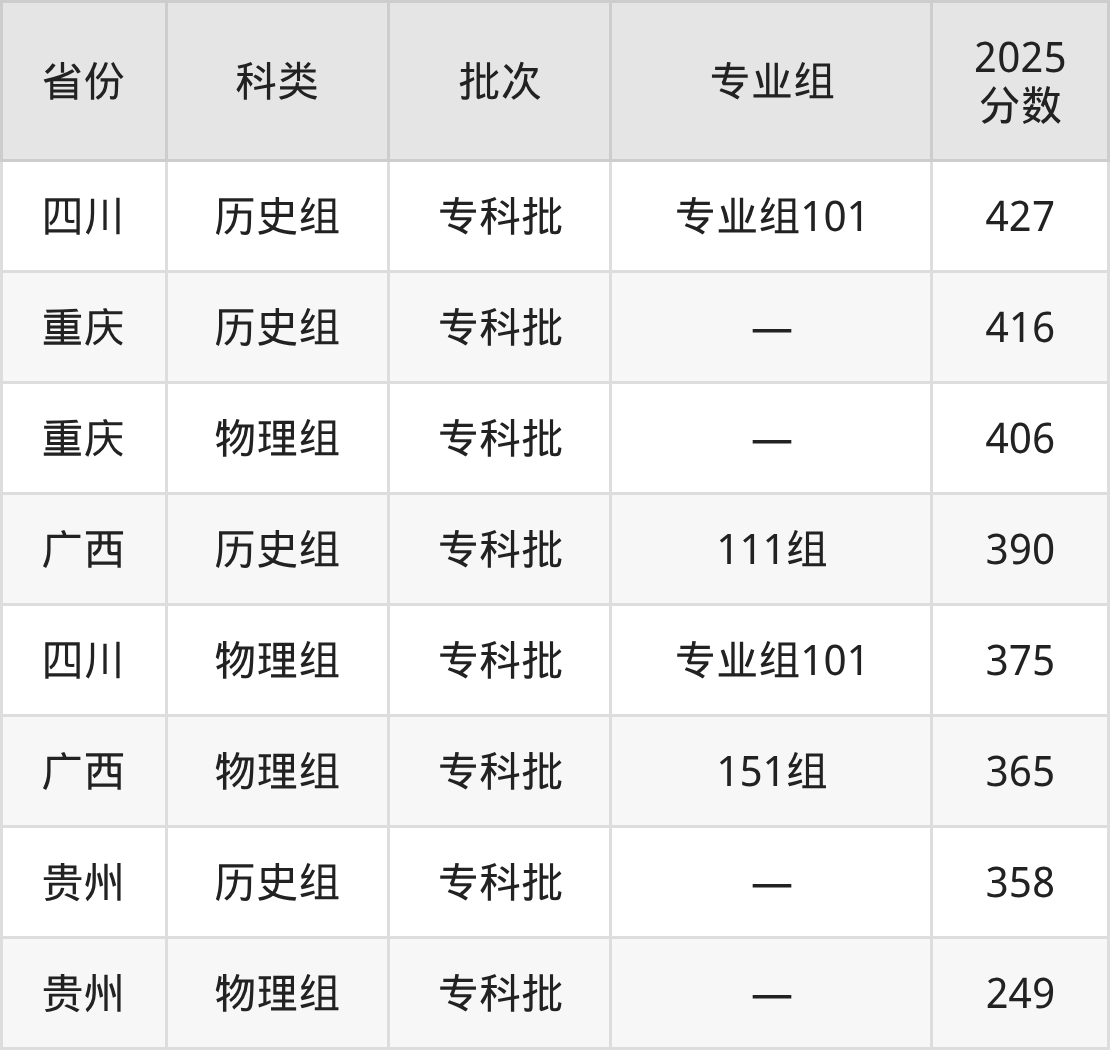 而四川地区历史组考生的分数门槛最高,2025年贵州护理职业技术学院专业组101在四川招生最低分为427分,考生至少要超专科线277分才有可能被录取。