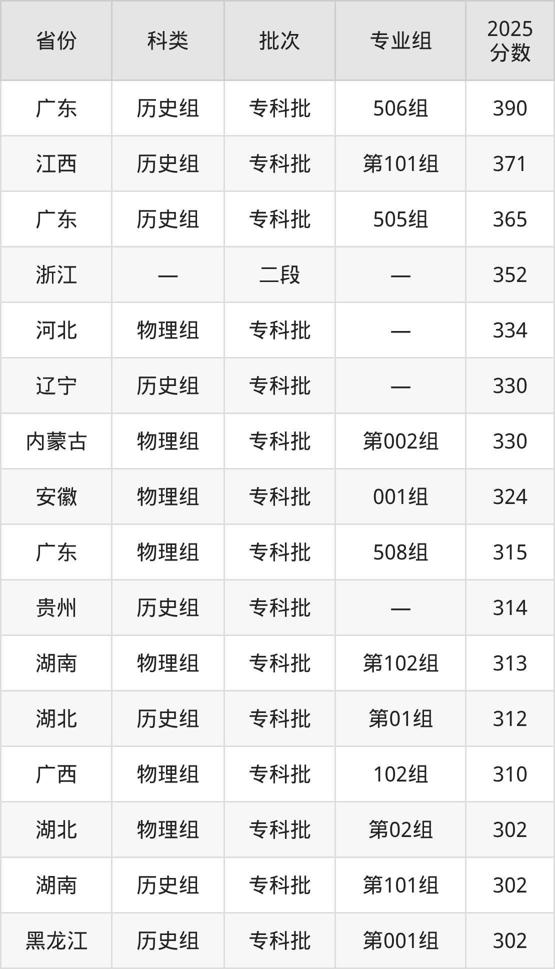 而广东地区历史组考生的分数门槛最高,2025年泸州医疗器械职业学院506组在广东招生最低分为390分,考生至少要超专科线175分才有可能被录取。