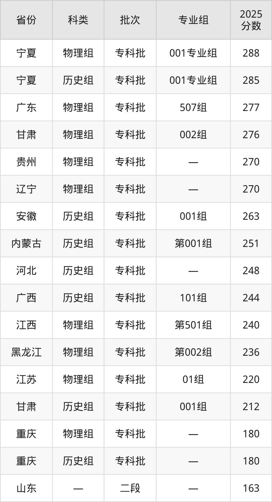 下面是泸州医疗器械职业学院2025年在全国各省的录取分数线一览表,供参考: