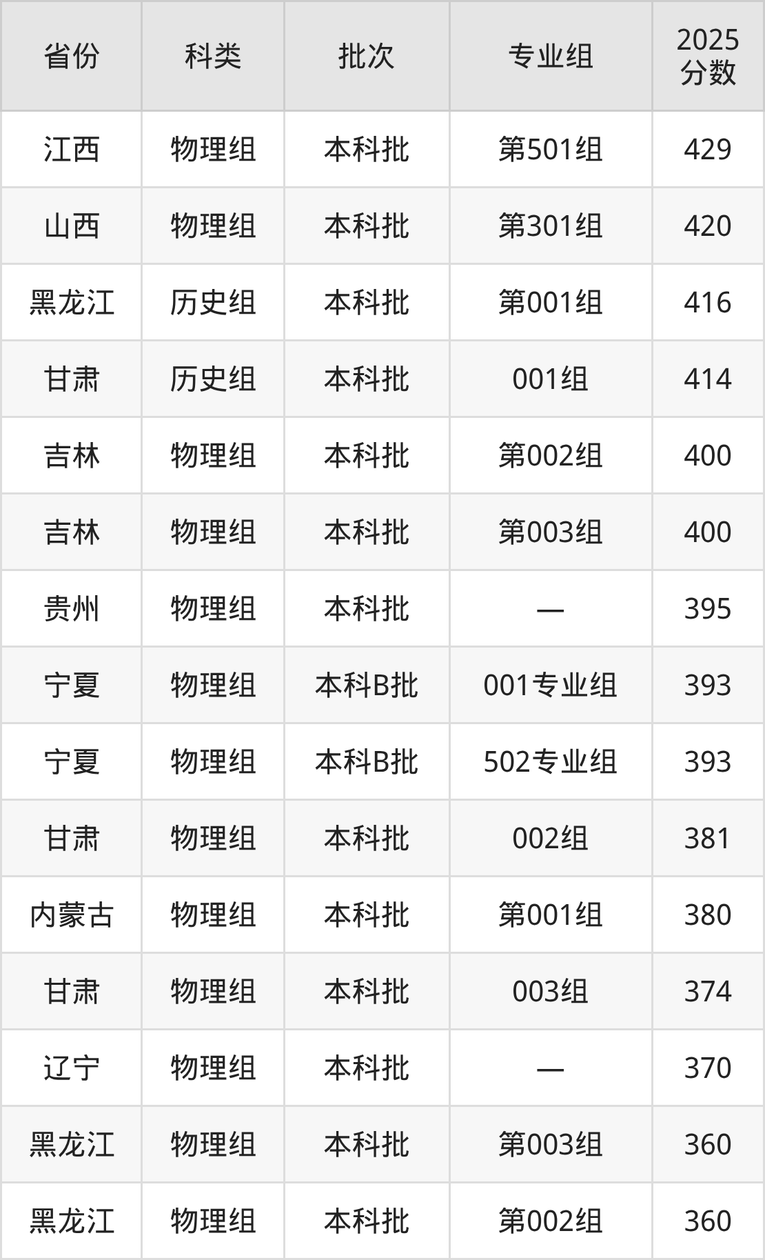 2025年哈尔滨远东理工学院在全国普通批次招生的录取分数范围位于360~491分之间,其中省内分数范围为360分~416分,历史组最低分专业组为“第001组”,考生416分即可报考,物理组最低分专业组为“第003组”,考生360分即可报考。