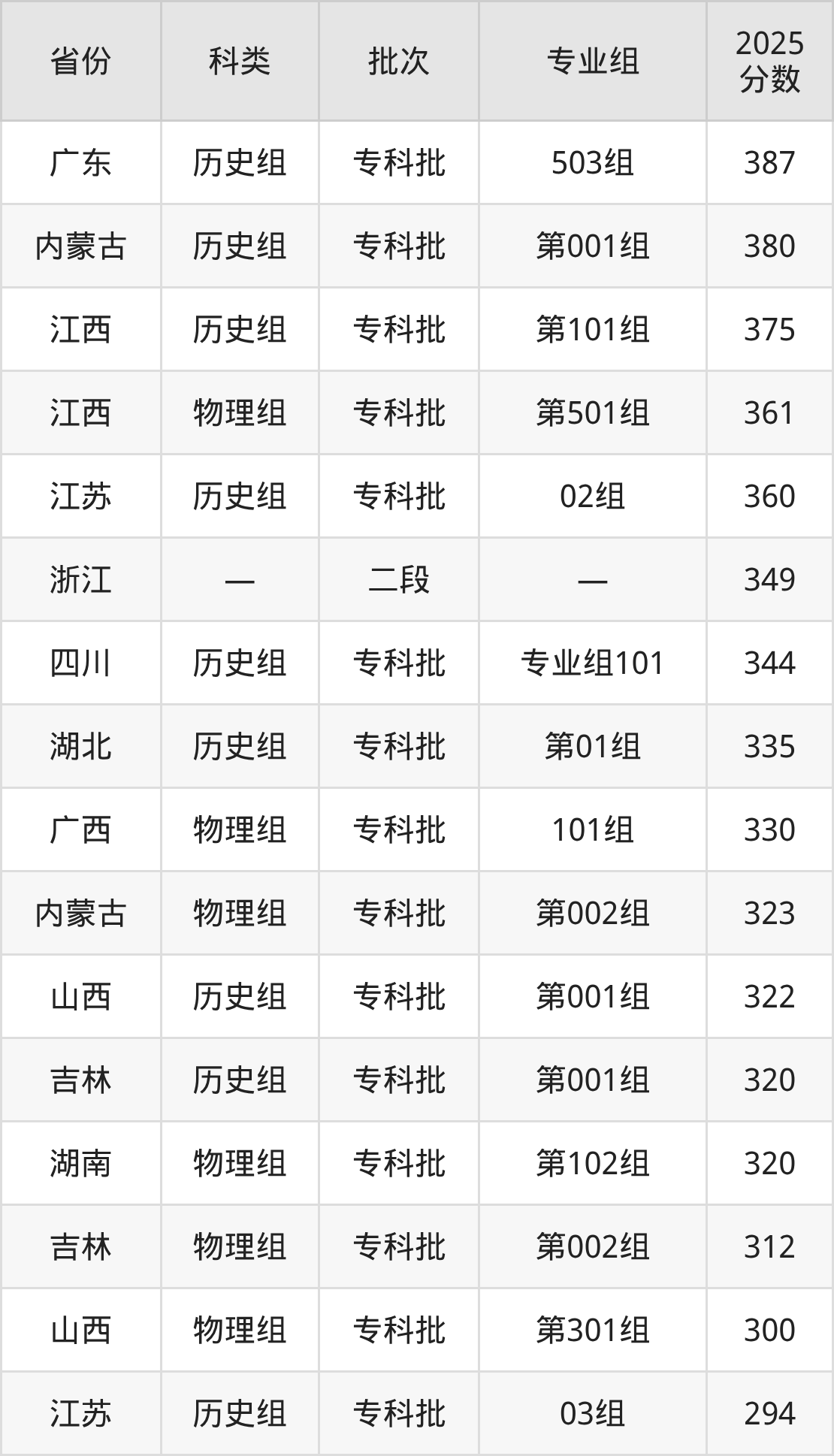 而广东地区历史组考生的分数门槛最高,2025年九州职业技术学院503组在广东招生最低分为387分,考生至少要超专科线172分才有可能被录取。
