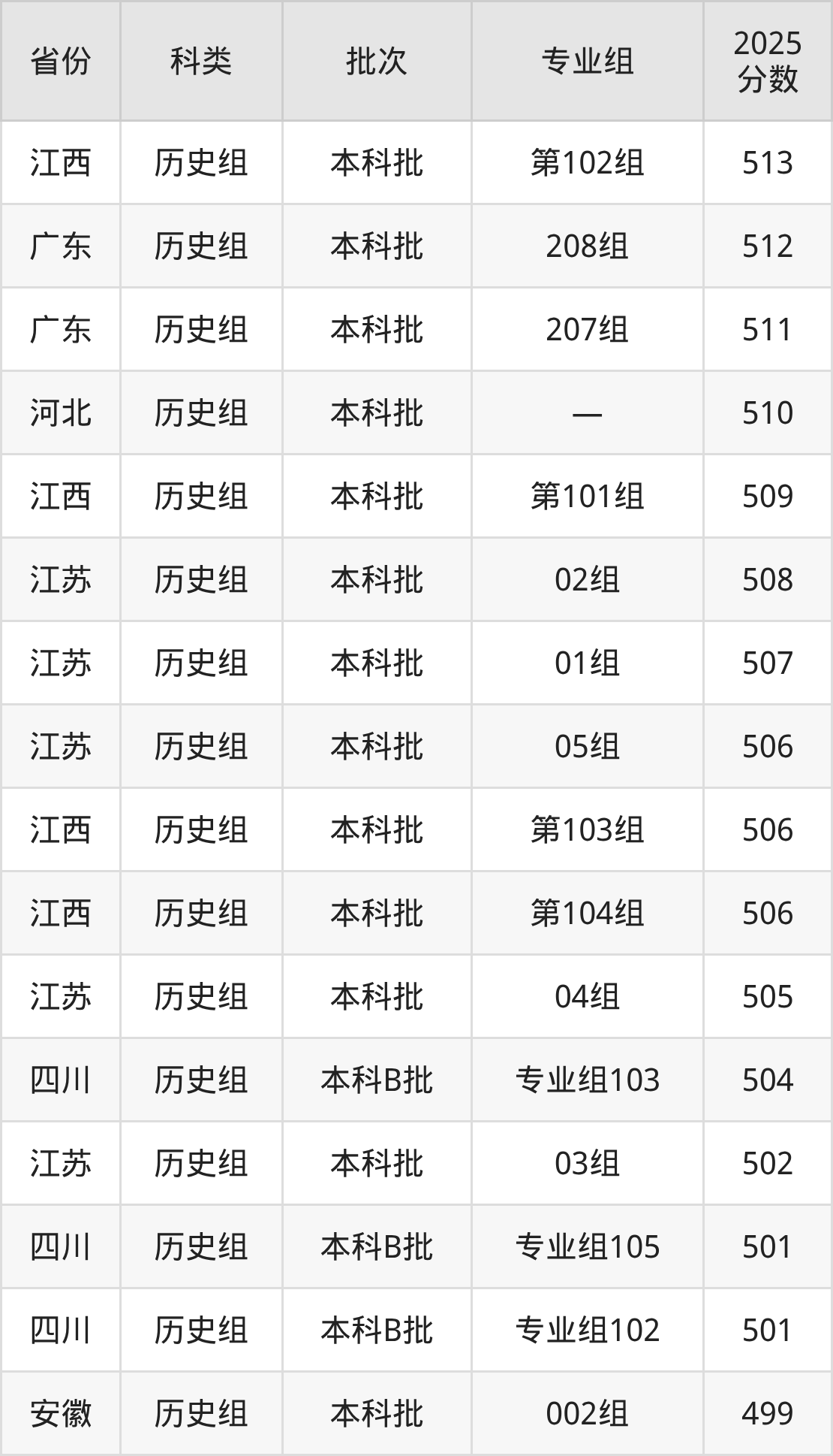 而江西地区历史组考生的分数门槛最高,2025年江苏师范大学科文学院第102组在江西招生最低分为513分,考生至少要超本科线27分才有可能被录取。