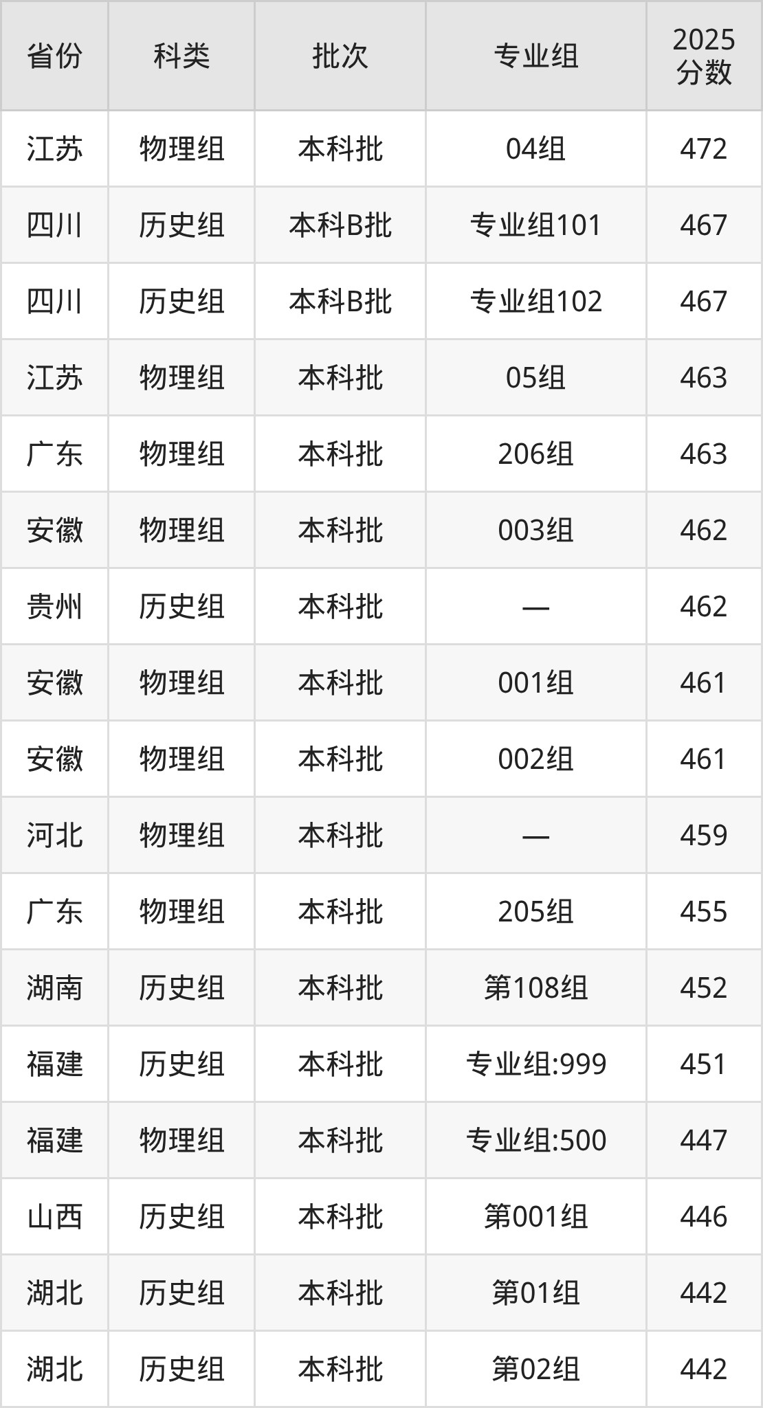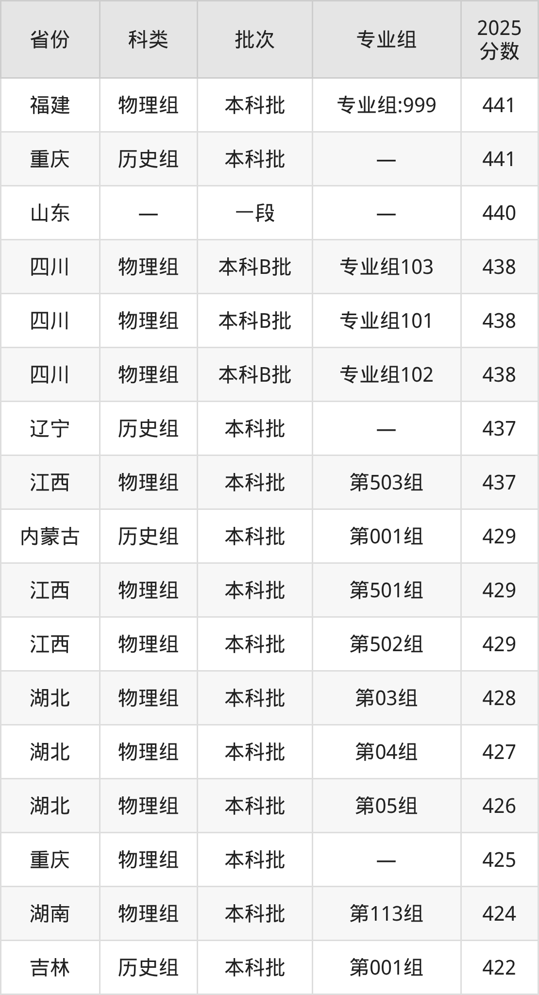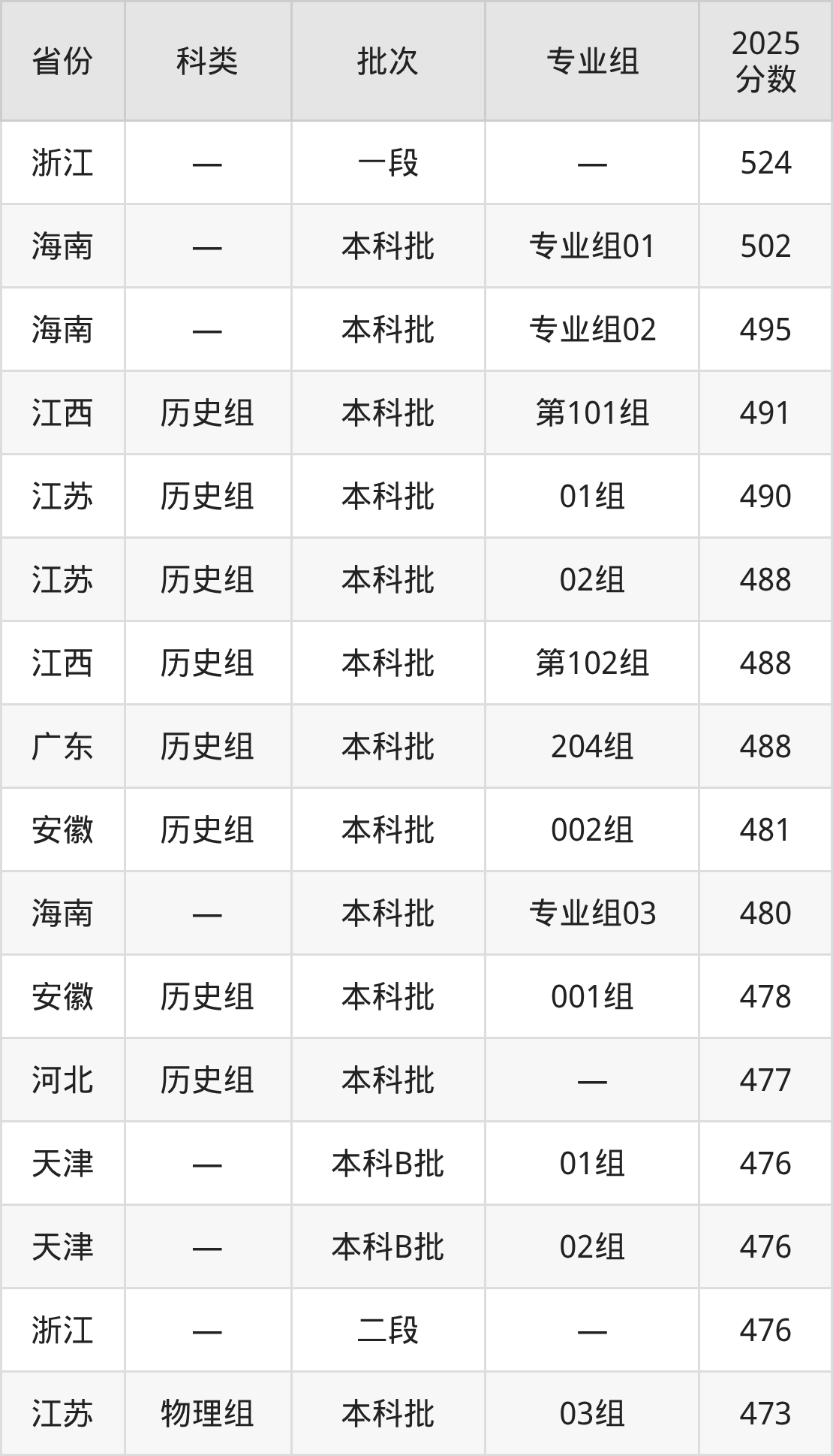 2025年湖南涉外经济学院在全国普通批次招生的录取分数范围位于342~524分之间,其中省内分数范围为424分~452分,历史组最低分专业组为“第108组”,考生452分即可报考,物理组最低分专业组为“第113组”,考生424分即可报考。