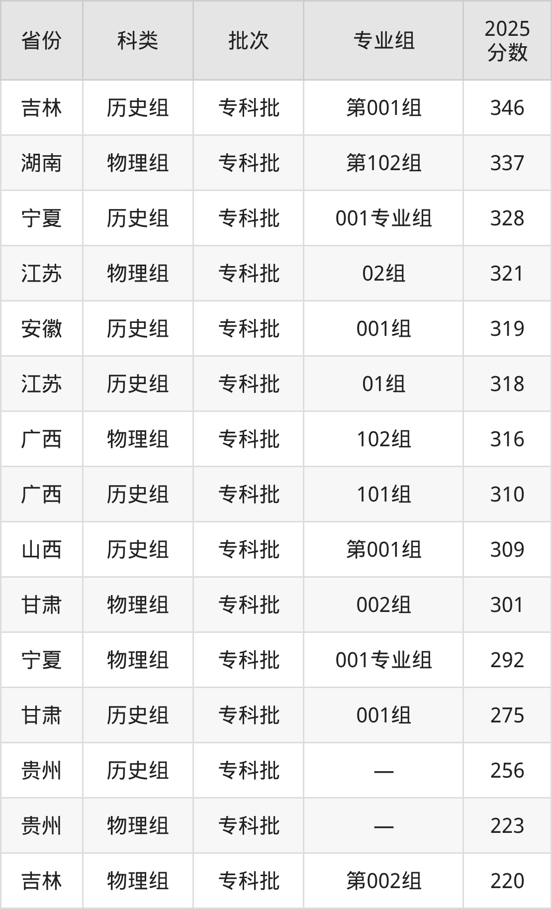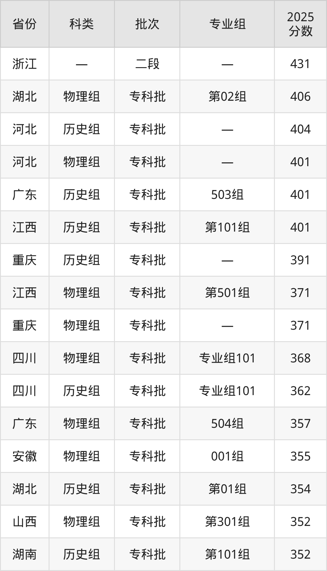 而浙江地区考生的分数门槛最高,2025年湖南城建职业技术学院在浙江招生最低分为431分,考生至少要超二段线163分才有可能被录取。