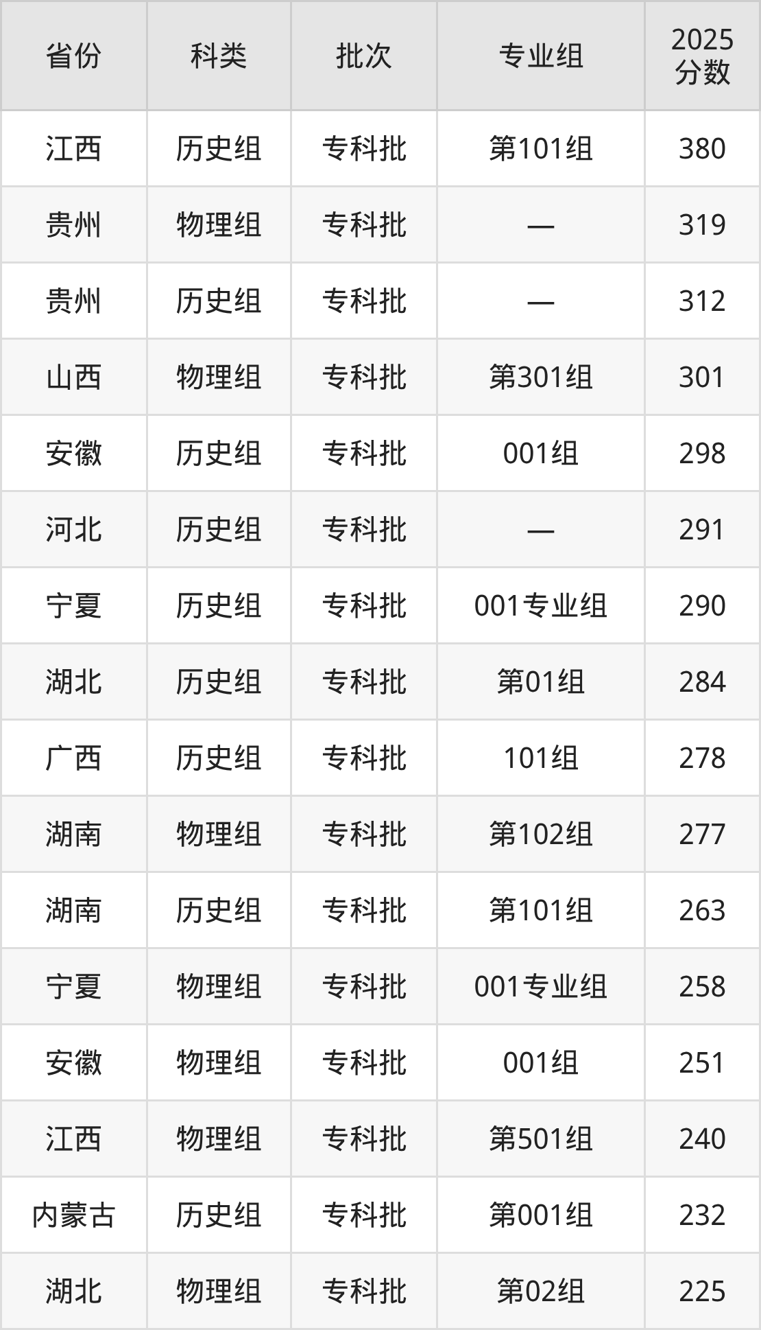 而江西地区历史组考生的分数门槛最高,2025年南阳职业学院第101组在江西招生最低分为380分,考生至少要超专科线90分才有可能被录取。