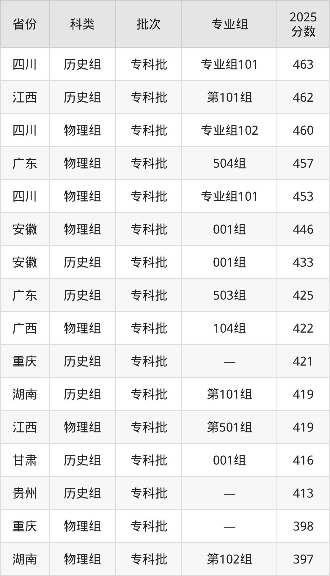 而四川地区历史组考生的分数门槛最高,2025年曲靖健康医学院专业组101在四川招生最低分为463分,考生至少要超专科线313分才有可能被录取。