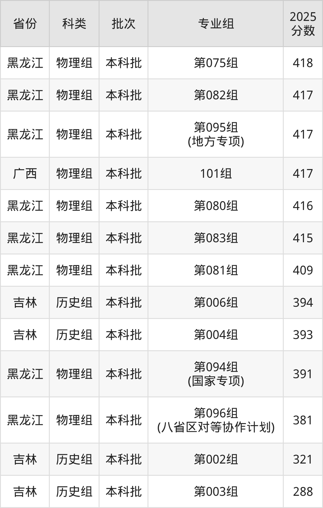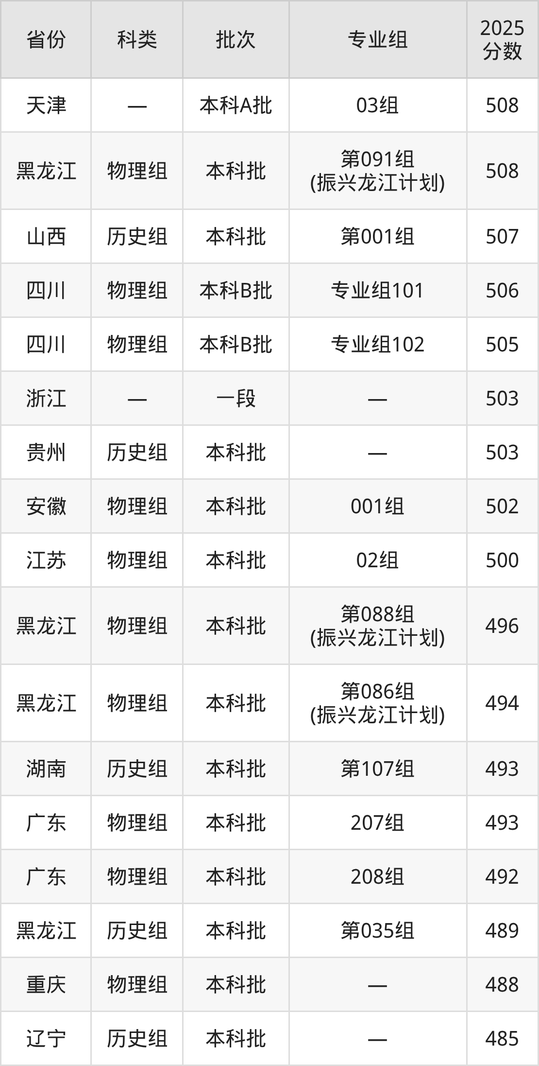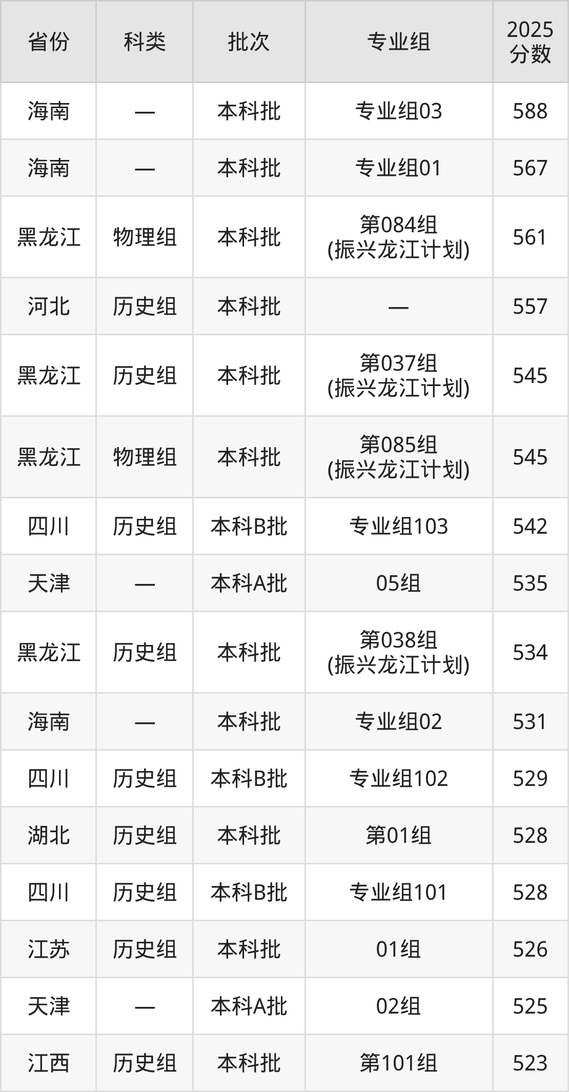 2025年齐齐哈尔大学在全国普通批次招生的录取分数范围位于288~588分之间,其中省内分数范围为381分~561分,物理组最低分专业组为“第096组(八省区对等协作计划)”,考生381分即可报考,历史组最低分专业组为“第041组(八省区对等协作计划)”,考生426分即可报考。