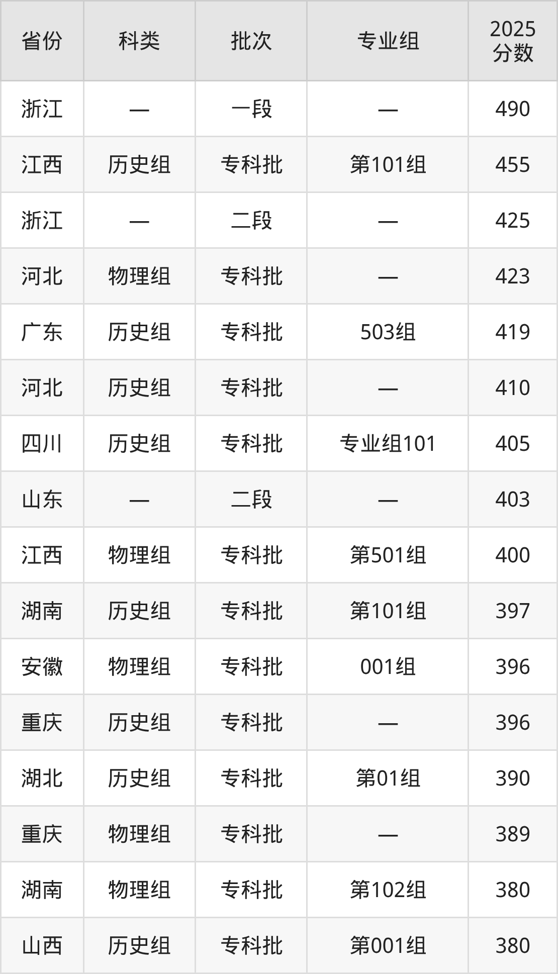 而浙江地区考生的分数门槛最高,2025年湖南工程职业技术学院在浙江招生最低分为490分,考生至少要超一段线0分才有可能被录取。