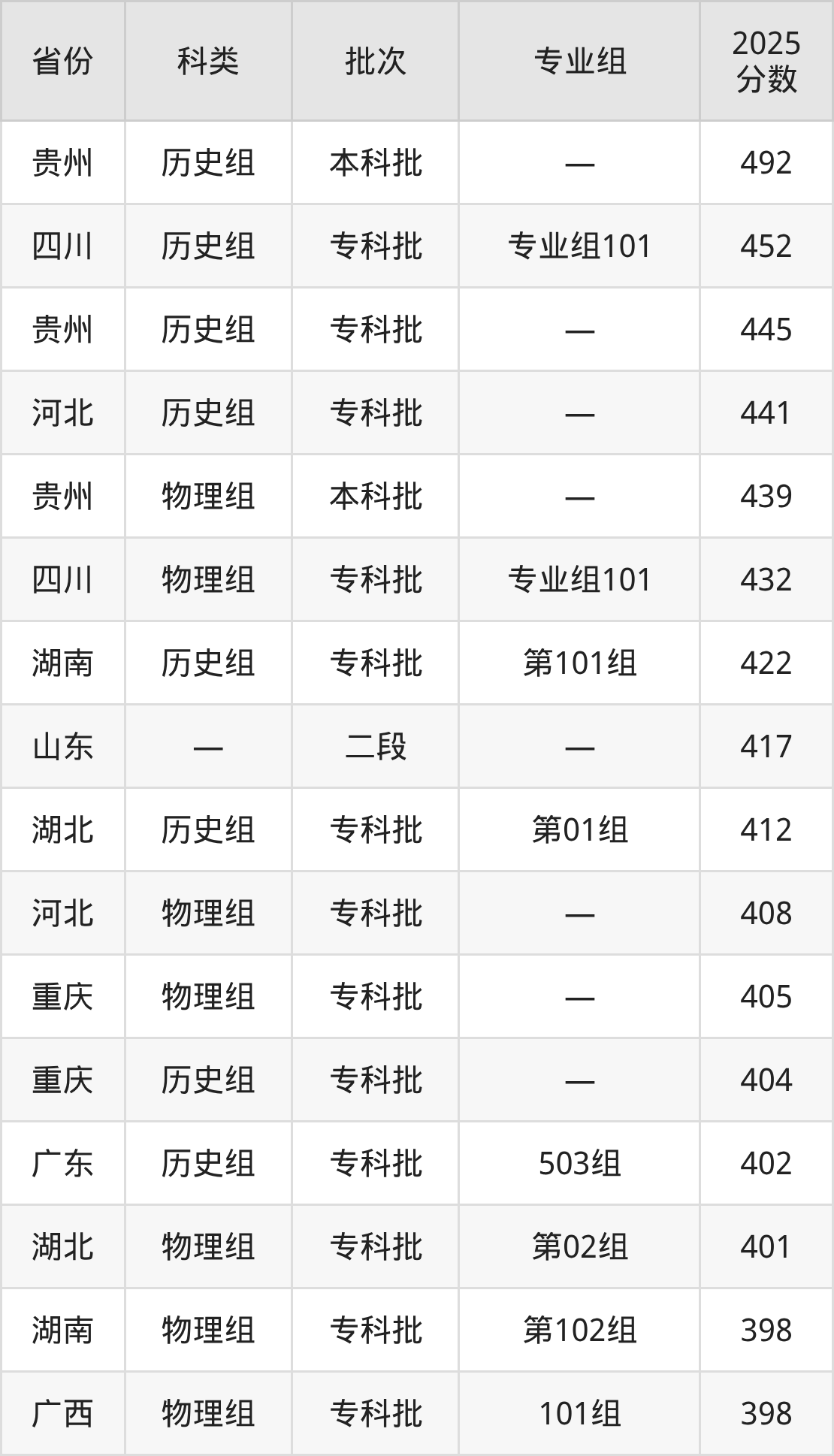 而四川地区历史组考生的分数门槛最高,2025年贵州轻工职业大学专业组101在四川招生最低分为452分,考生至少要超专科线302分才有可能被录取。