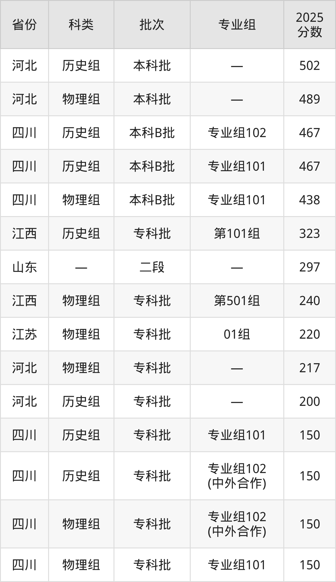 2025年成都艺术职业大学在全国普通批次招生的录取分数范围位于150~502分之间,其中省内分数范围为150分~467分,历史组最低分专业组为“专业组101”,考生150分即可报考,物理组最低分专业组为“专业组102(中外合作)”,考生150分即可报考。