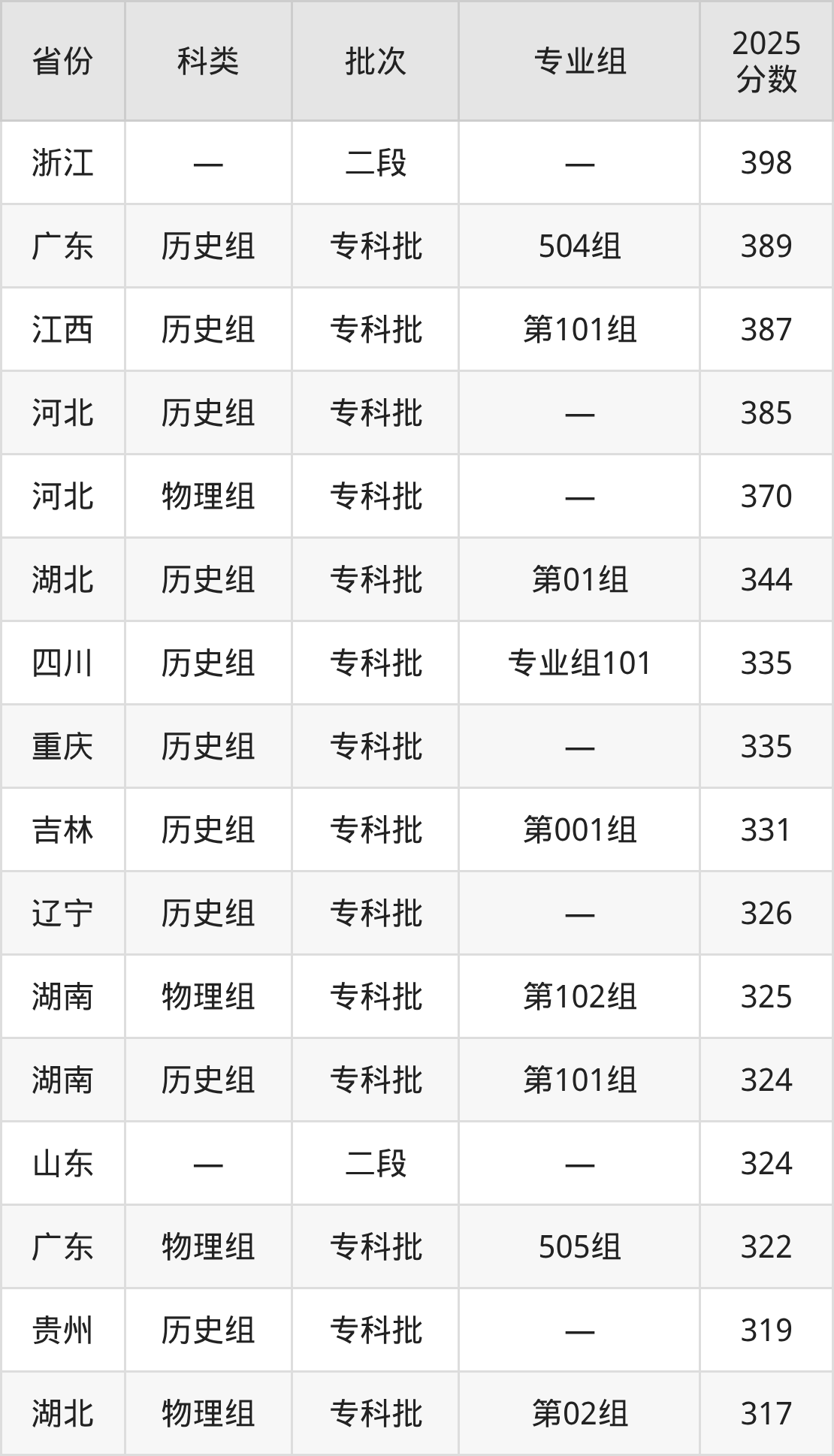 而浙江地区考生的分数门槛最高,2025年齐齐哈尔高等师范专科学校在浙江招生最低分为398分,考生至少要超二段线130分才有可能被录取。