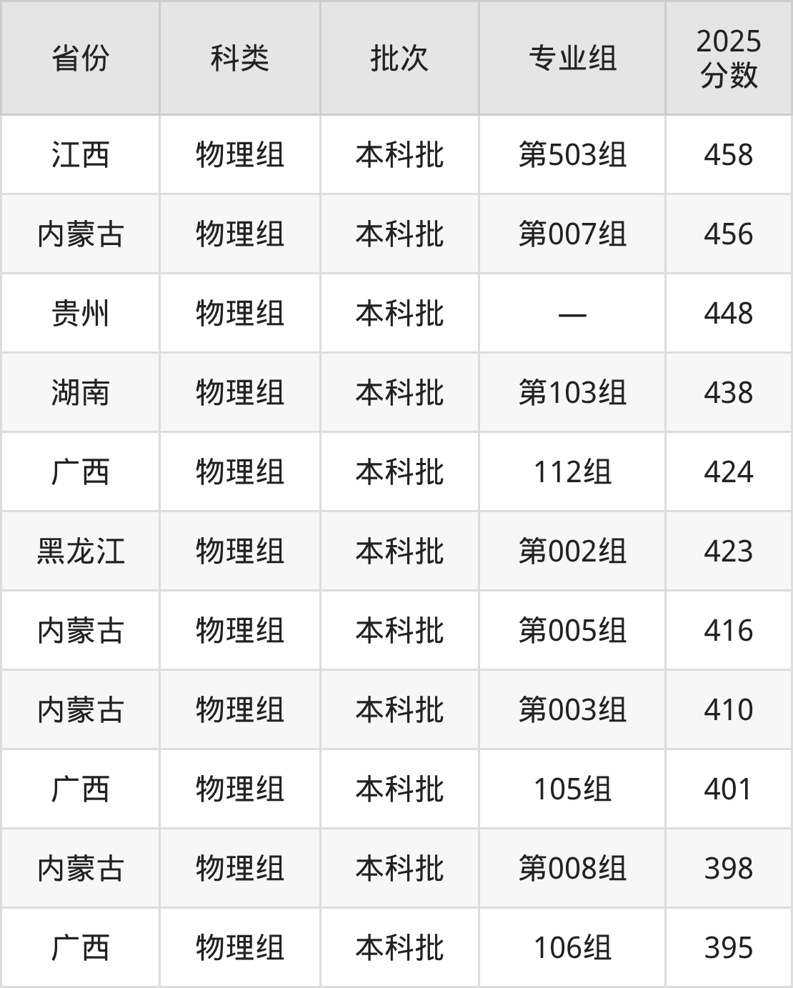 2025年内蒙古科技大学包头医学院在全国普通批次招生的录取分数范围位于395~547分之间,其中自治区内分数范围为398分~542分,历史组最低分专业组为“第009组”,考生465分即可报考,物理组最低分专业组为“第008组”,考生398分即可报考。