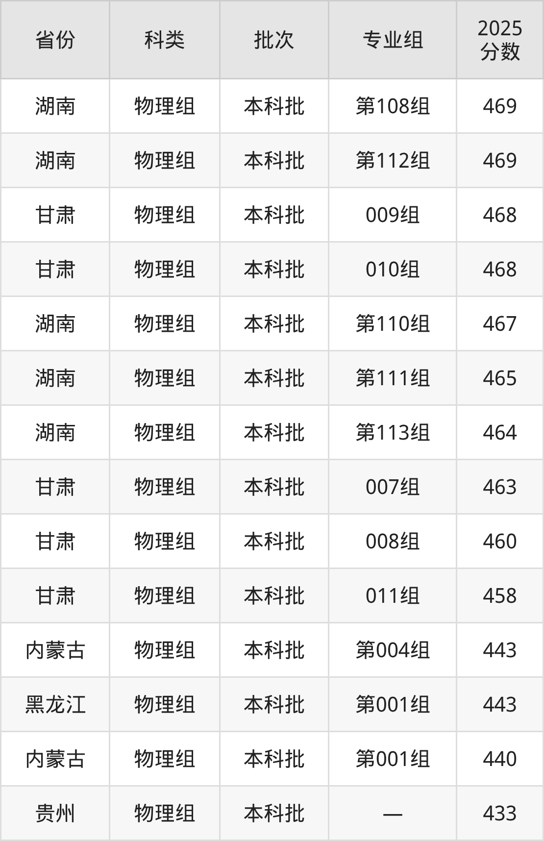 遵义师范学院在省外招生的最低分为440分,其中内蒙古地区物理组考生上遵义师范学院的分数门槛最低,考生成绩超本科线65分(440分)可上。其次是黑龙江物理组考生,上遵义师范学院至少要超本科线83分(443分)。