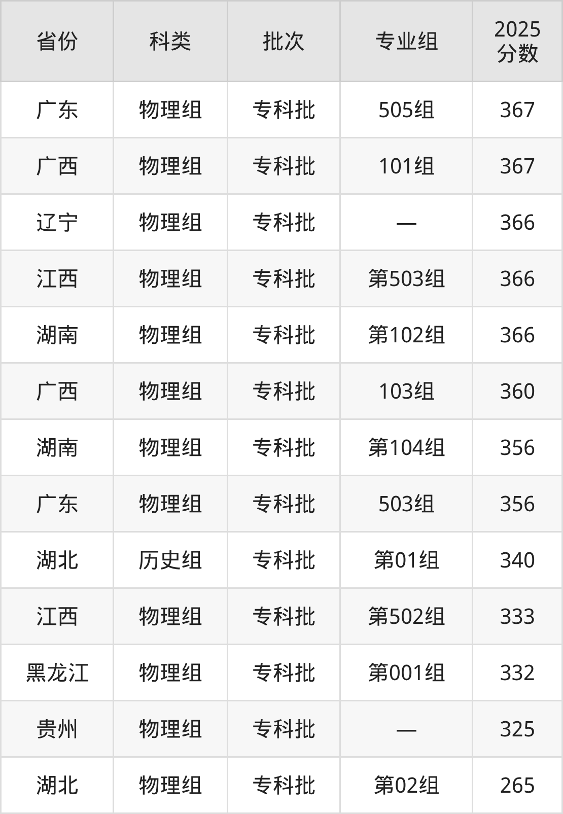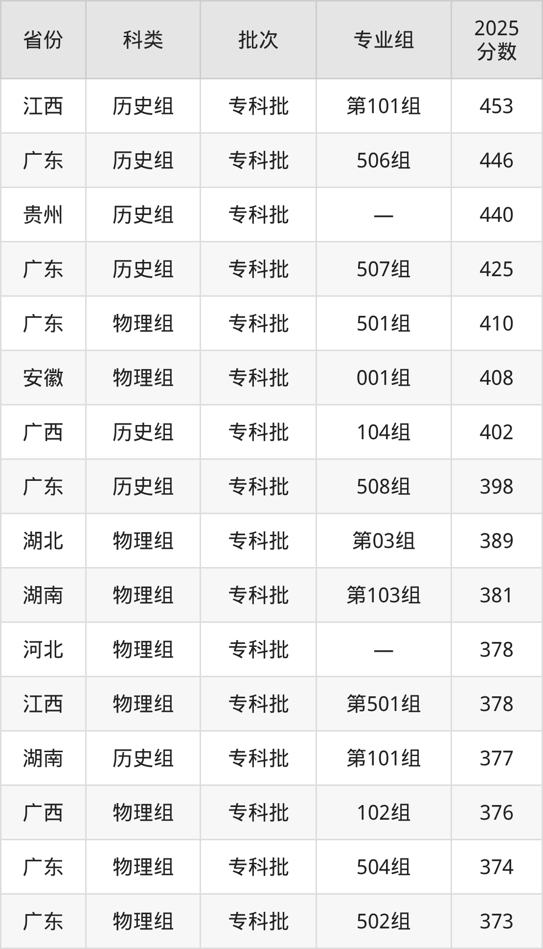 而江西地区历史组考生的分数门槛最高,2025年广东茂名健康职业学院第101组在江西招生最低分为453分,考生至少要超专科线163分才有可能被录取。