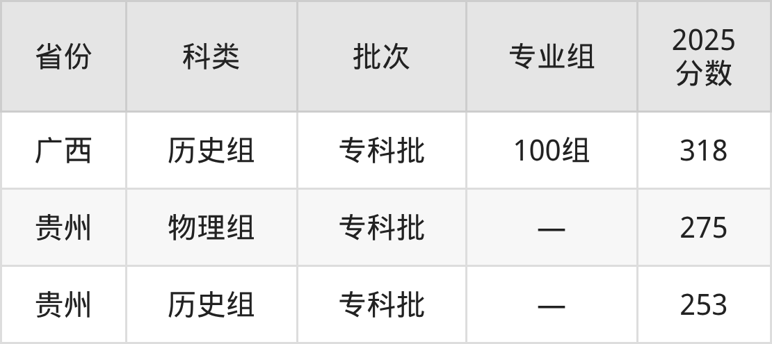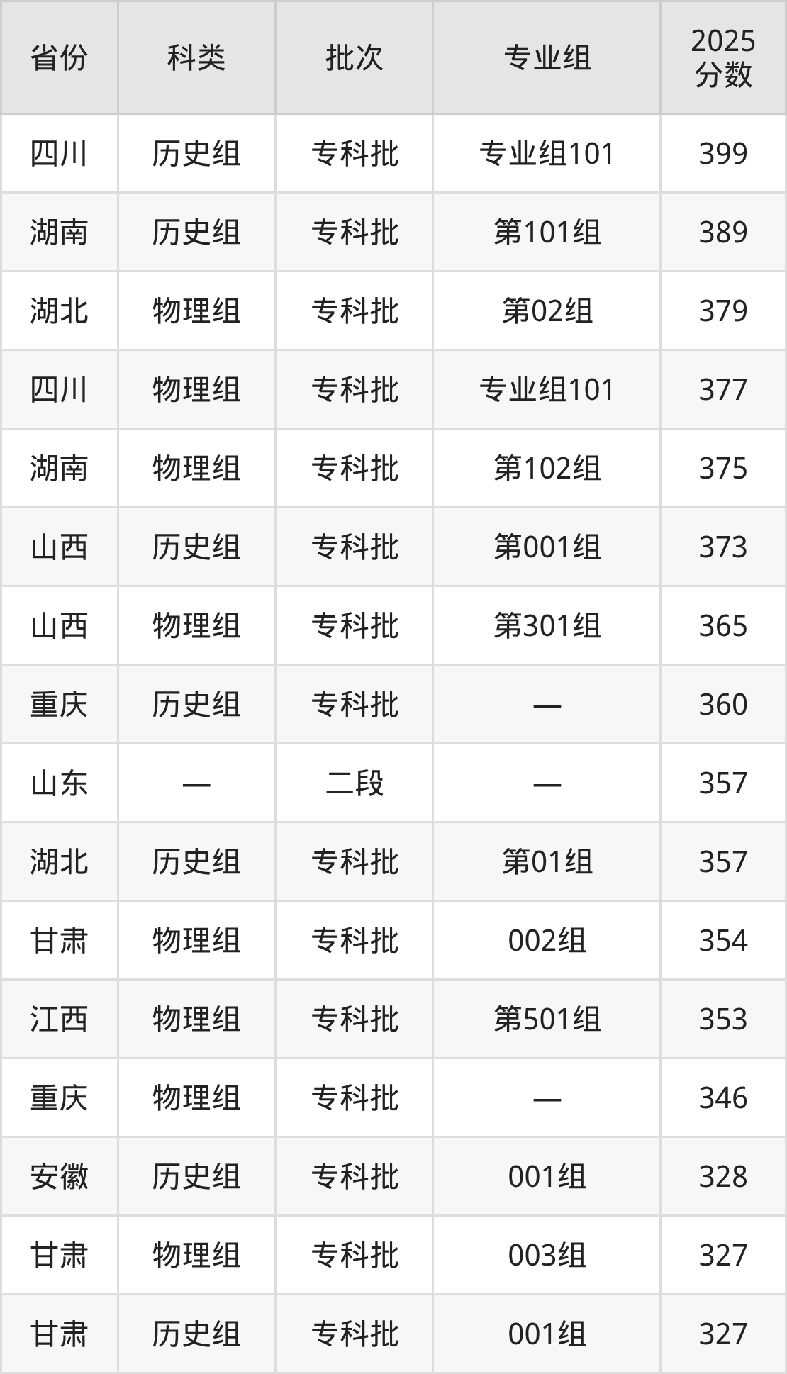 而四川地区历史组考生的分数门槛最高,2025年重庆旅游职业学院专业组101在四川招生最低分为399分,考生至少要超专科线249分才有可能被录取。