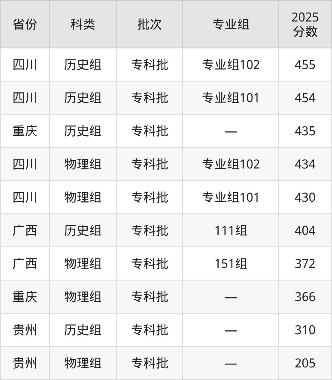 而四川地区历史组考生的分数门槛最高,2025年贵州农业职业学院专业组102在四川招生最低分为455分,考生至少要超专科线305分才有可能被录取。