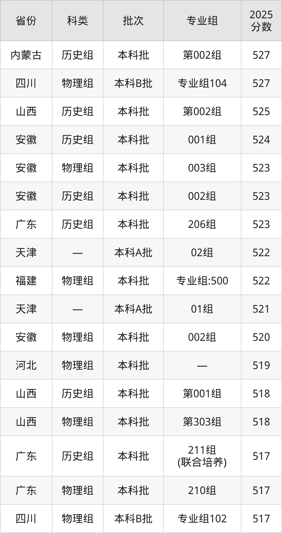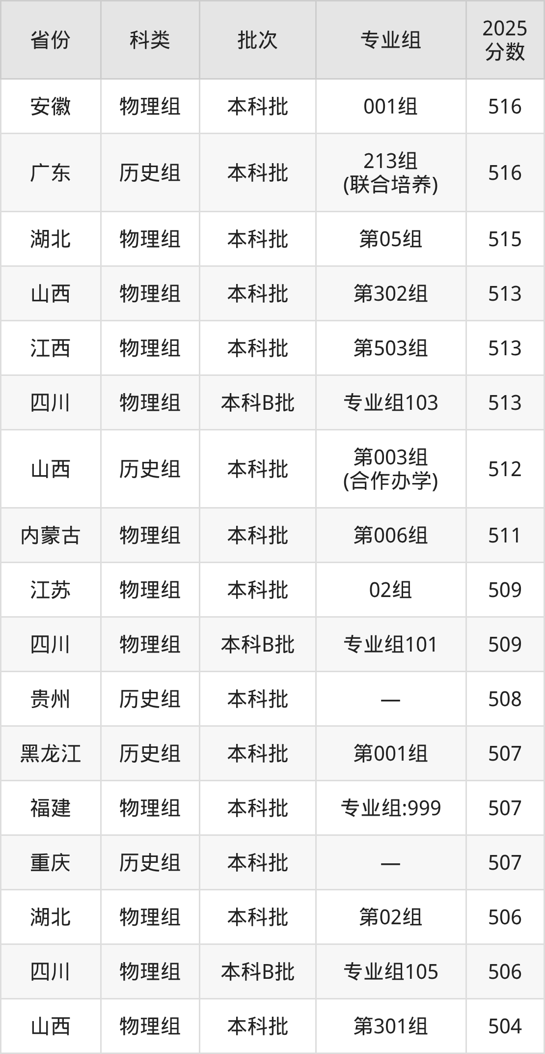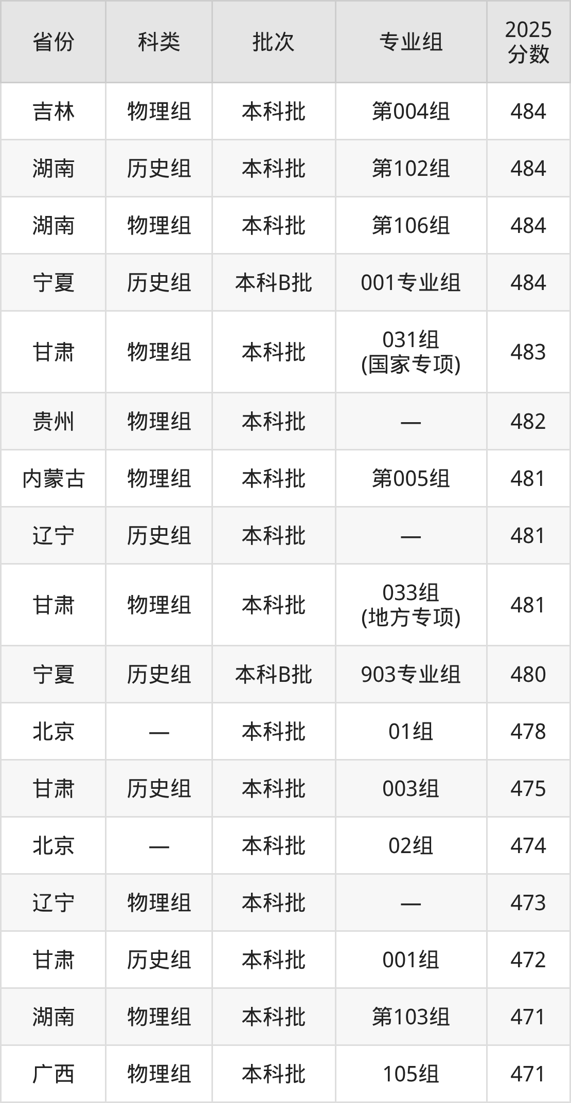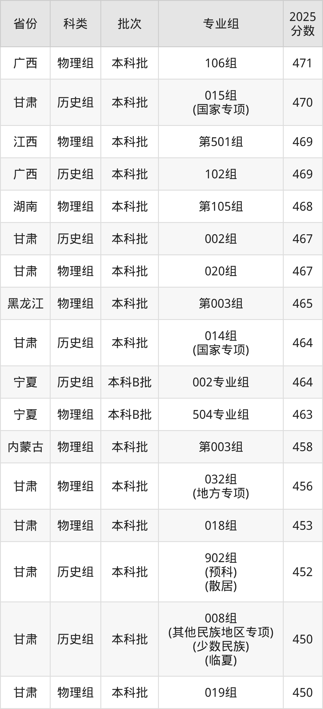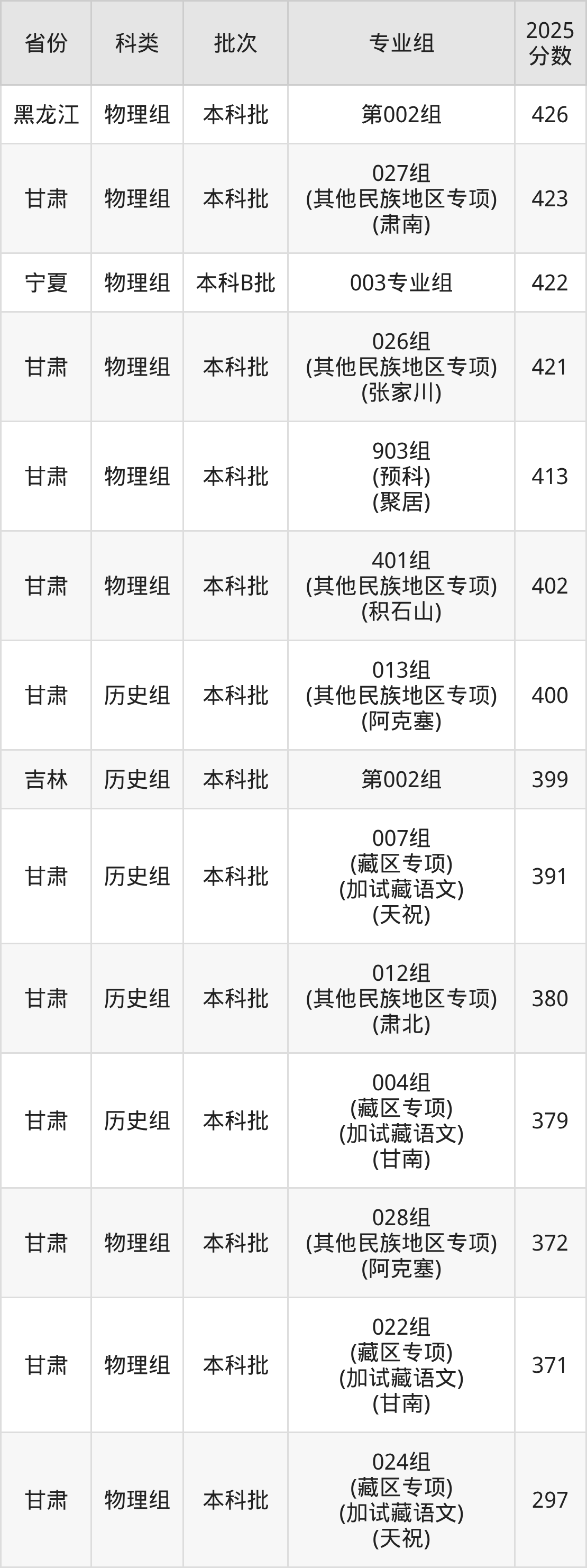 2025年兰州财经大学在全国普通批次招生的录取分数范围位于297~569分之间,其中省内分数范围为297分~485分,历史组最低分专业组为“004组(藏区专项)(加试藏语文)(甘南)”,考生379分即可报考,物理组最低分专业组为“024组(藏区专项)(加试藏语文)(天祝)”,考生297分即可报考。