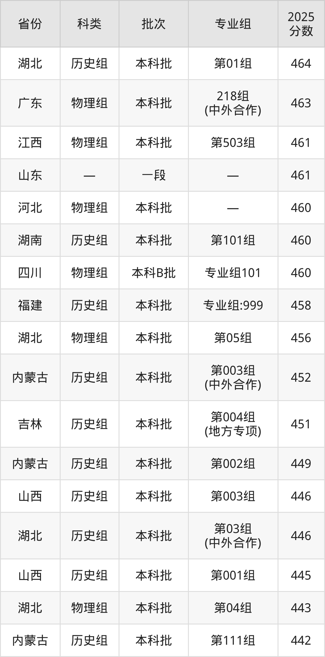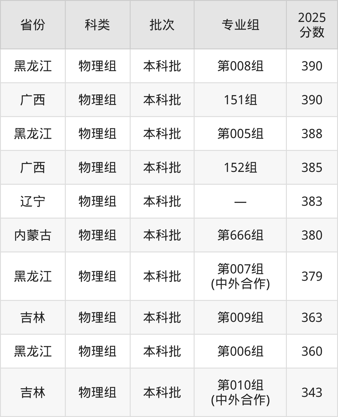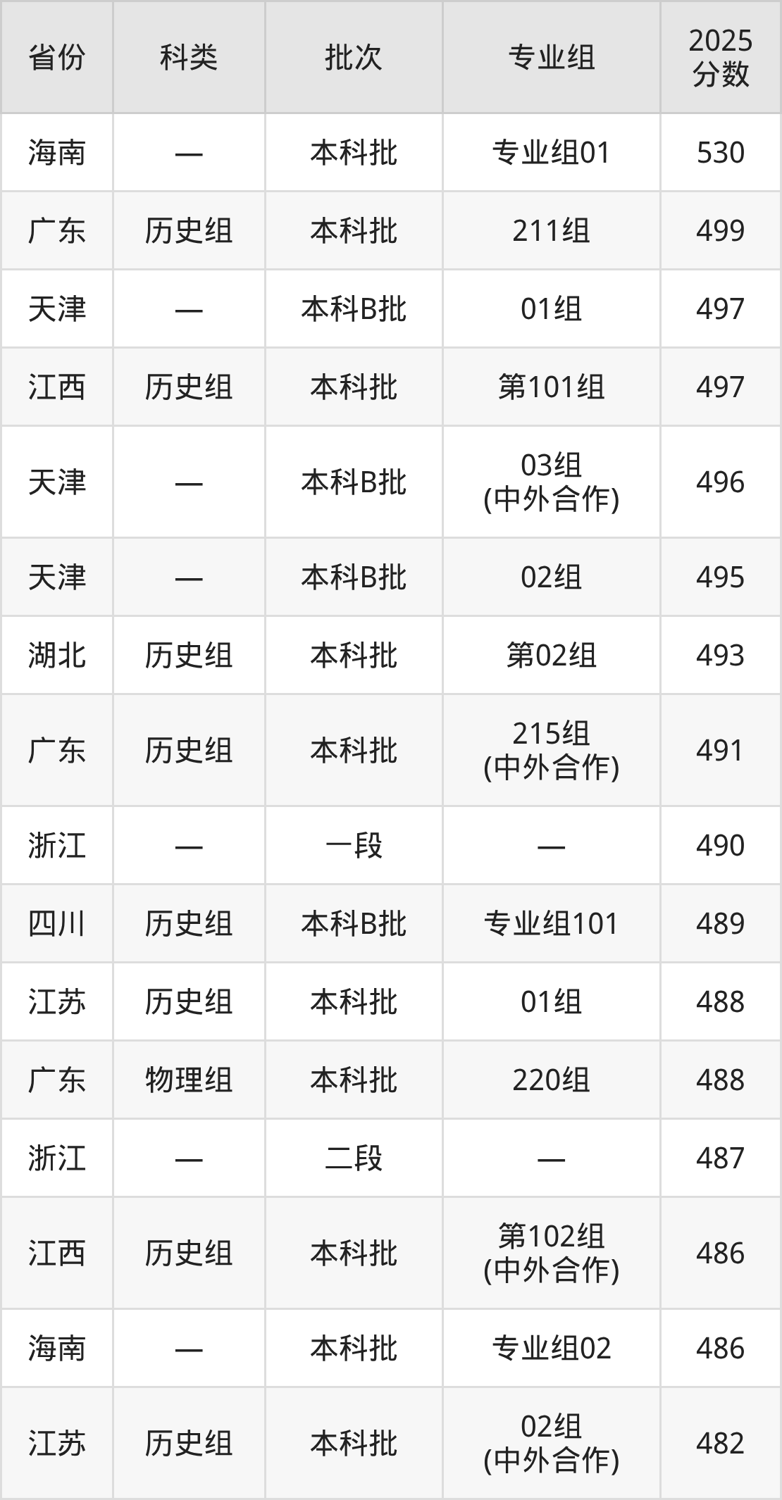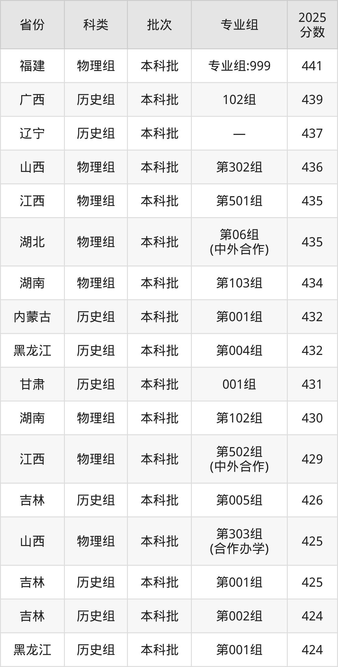 2025年吉林外国语大学在全国普通批次招生的录取分数范围位于343~530分之间,其中省内分数范围为343分~451分,物理组最低分专业组为“第010组(中外合作)”,考生343分即可报考,历史组最低分专业组为“第003组(中外合作)”,考生397分即可报考。