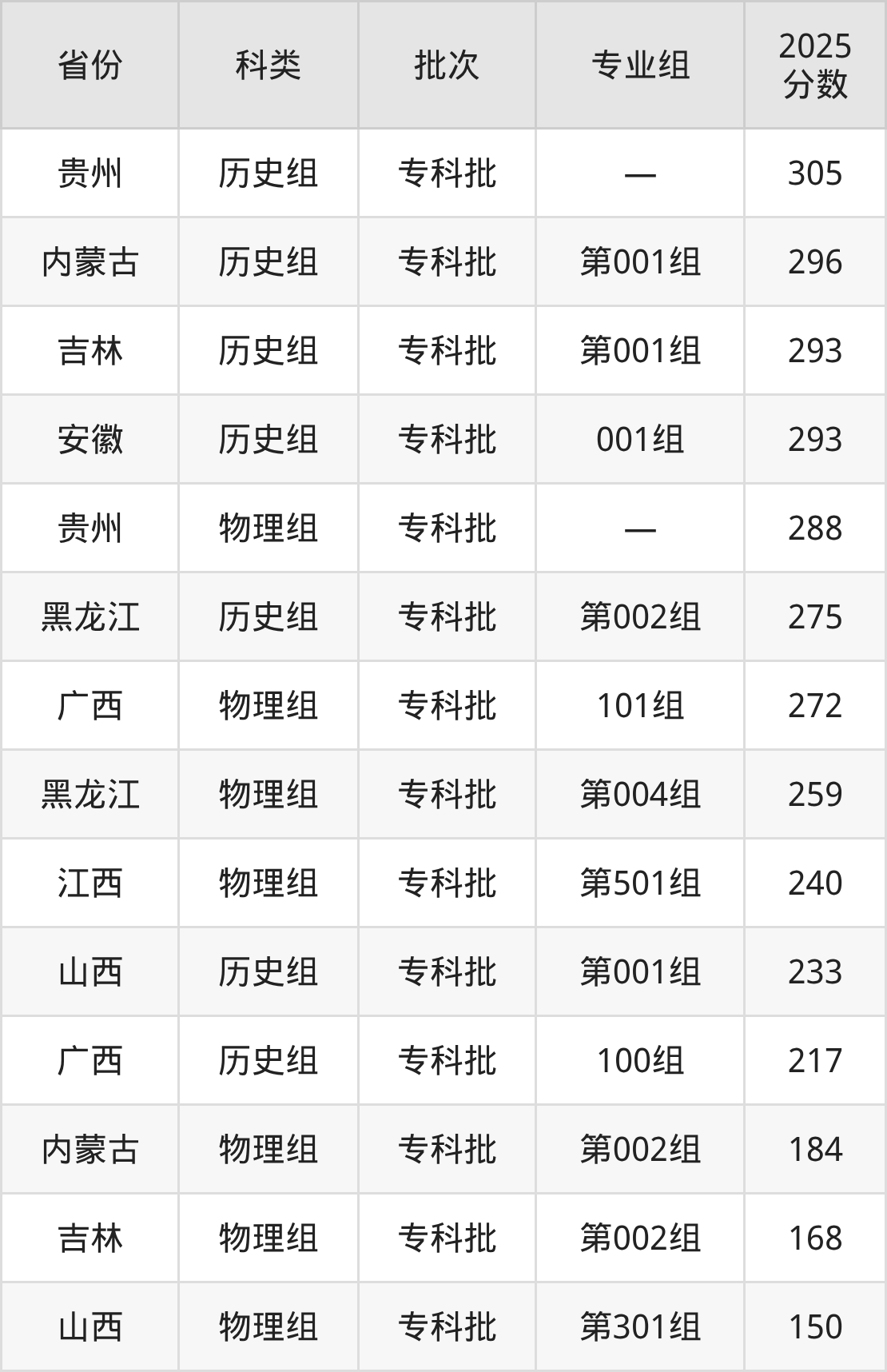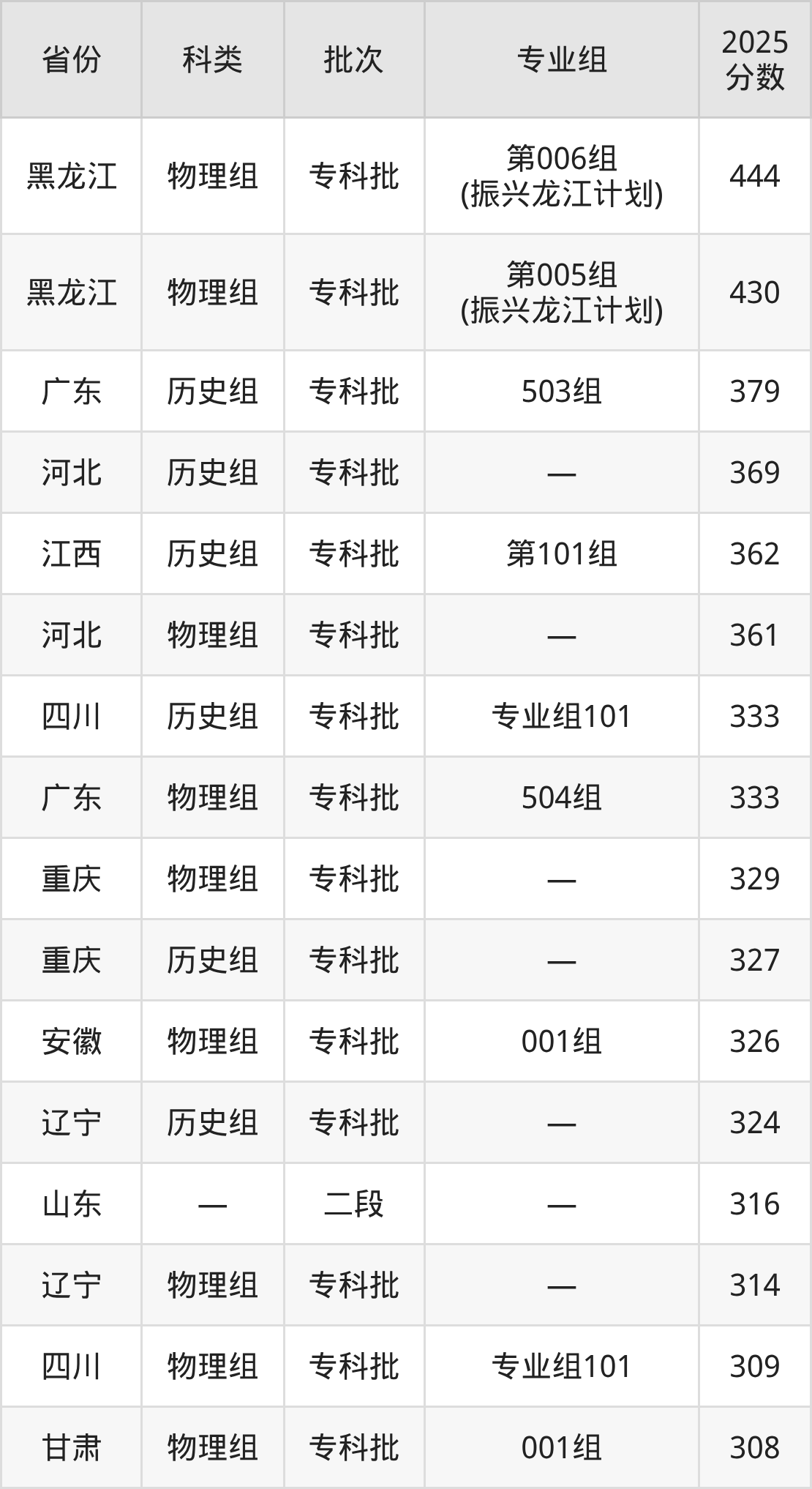 而广东地区历史组考生的分数门槛最高,2025年黑龙江林业职业技术学院503组在广东招生最低分为379分,考生至少要超专科线164分才有可能被录取。