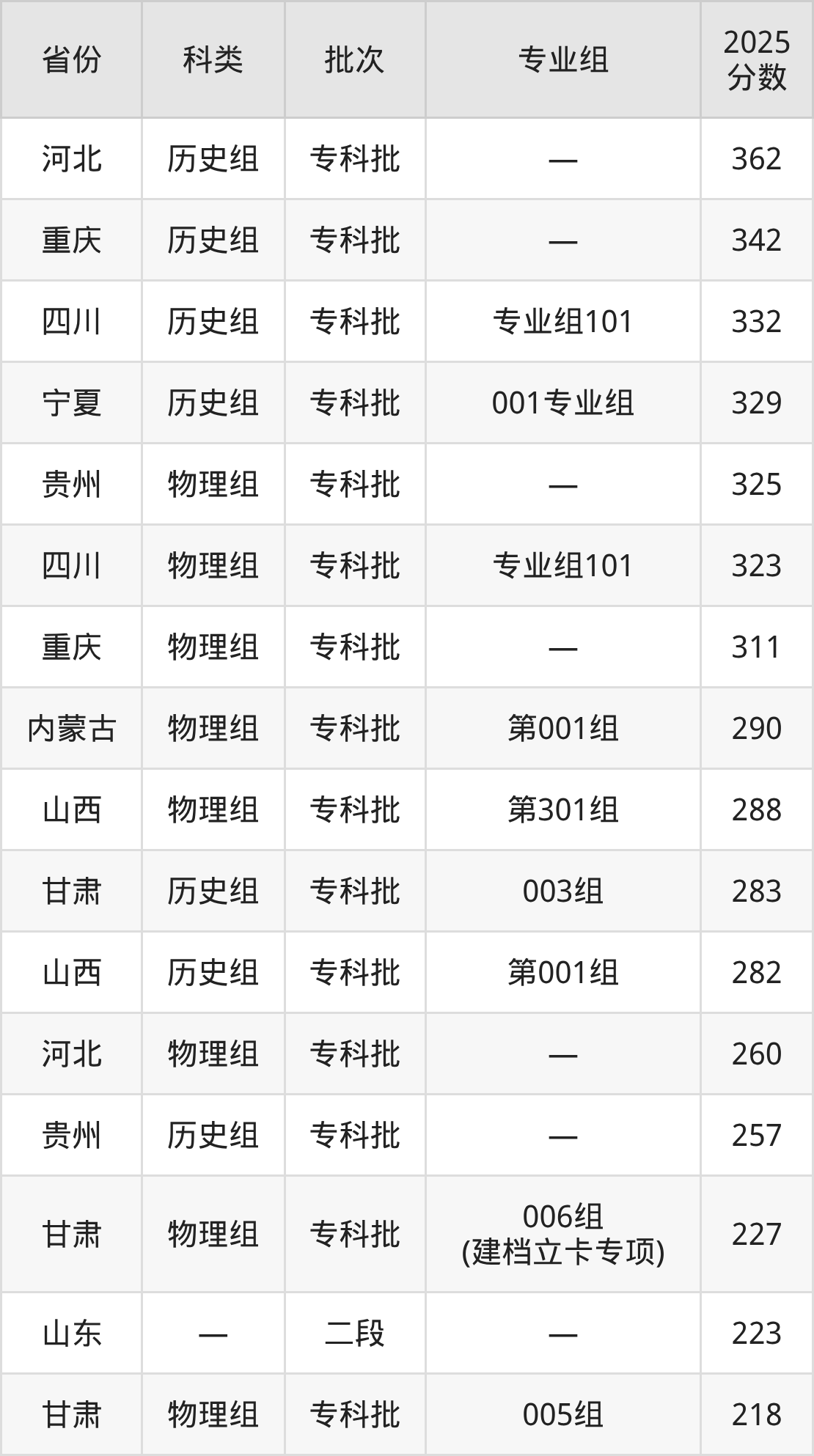 下面是甘肃畜牧工程职业技术学院2025年在全国各省的录取分数线一览表,供参考: