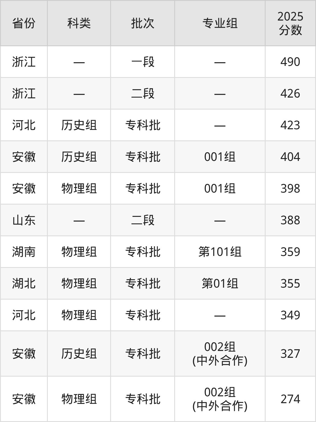 而浙江地区考生的分数门槛最高,2025年铜陵职业技术学院在浙江招生最低分为490分,考生至少要超一段线0分才有可能被录取。