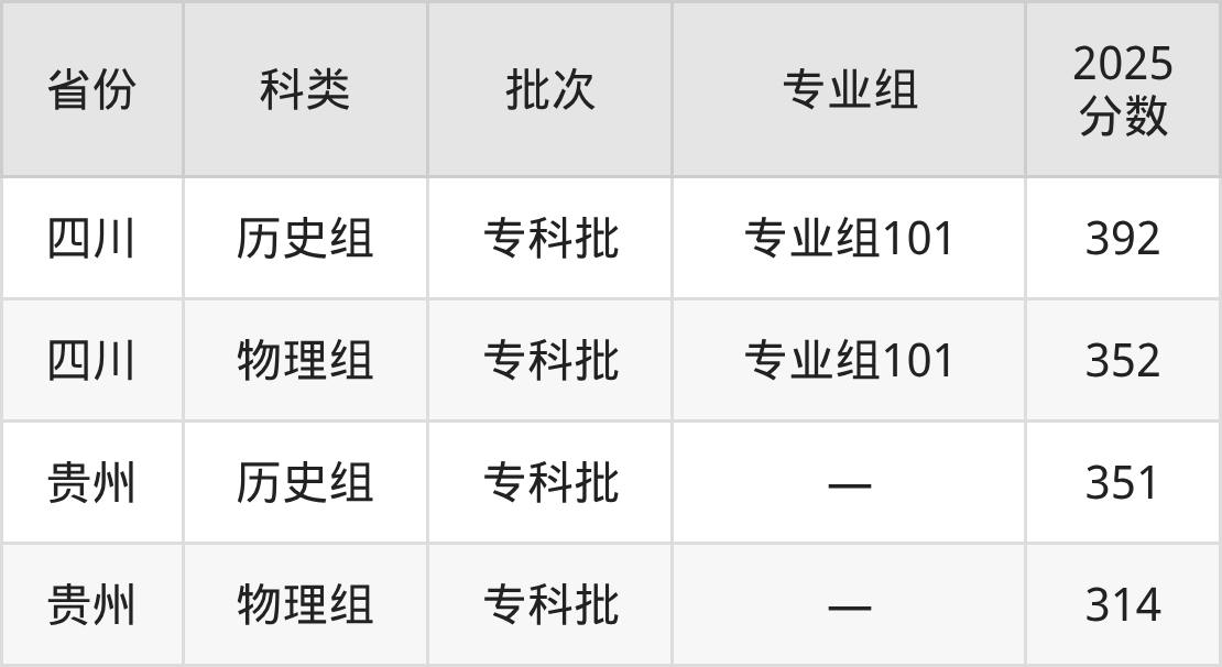 而四川地区历史组考生的分数门槛最高,2025年云南旅游职业学院专业组101在四川招生最低分为392分,考生至少要超专科线242分才有可能被录取。