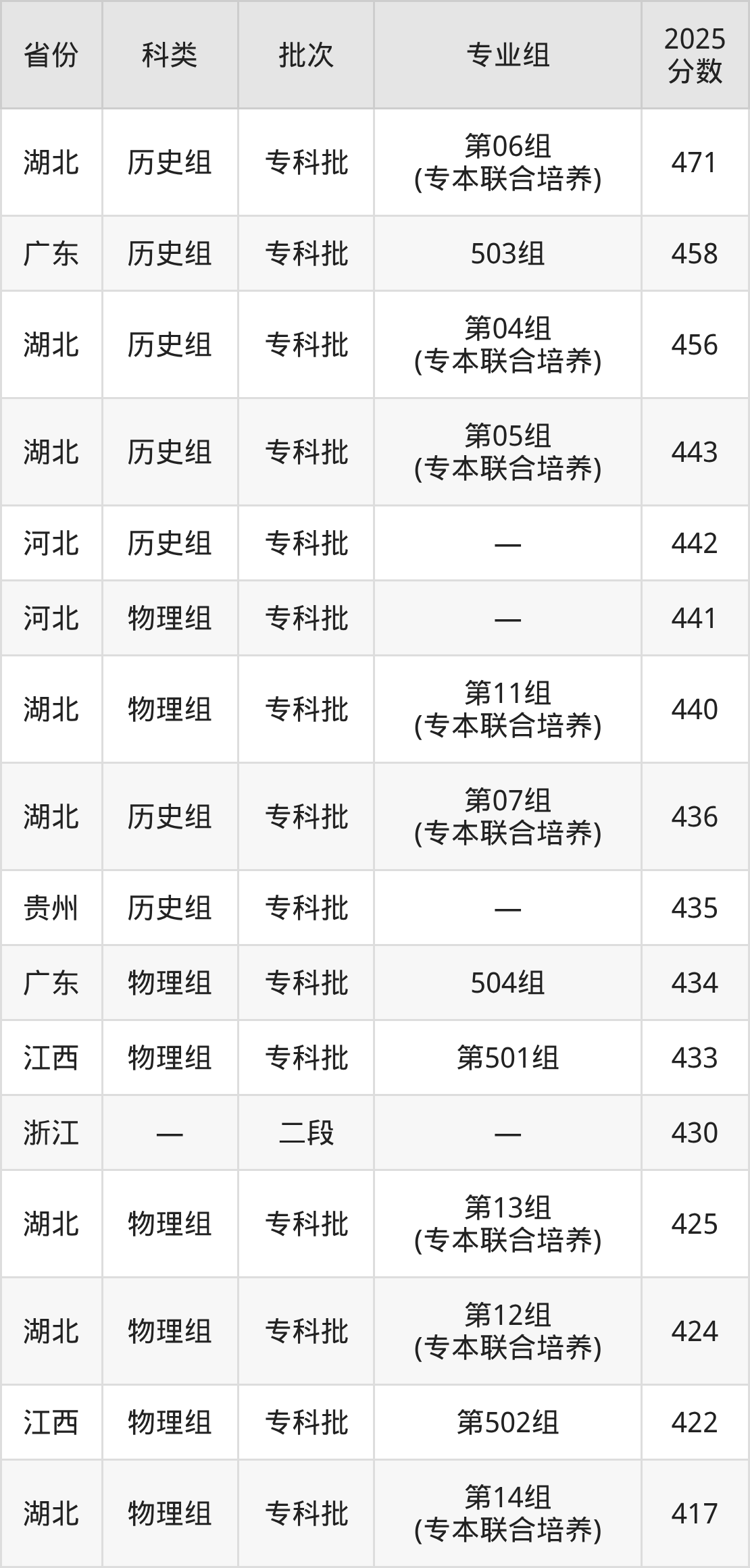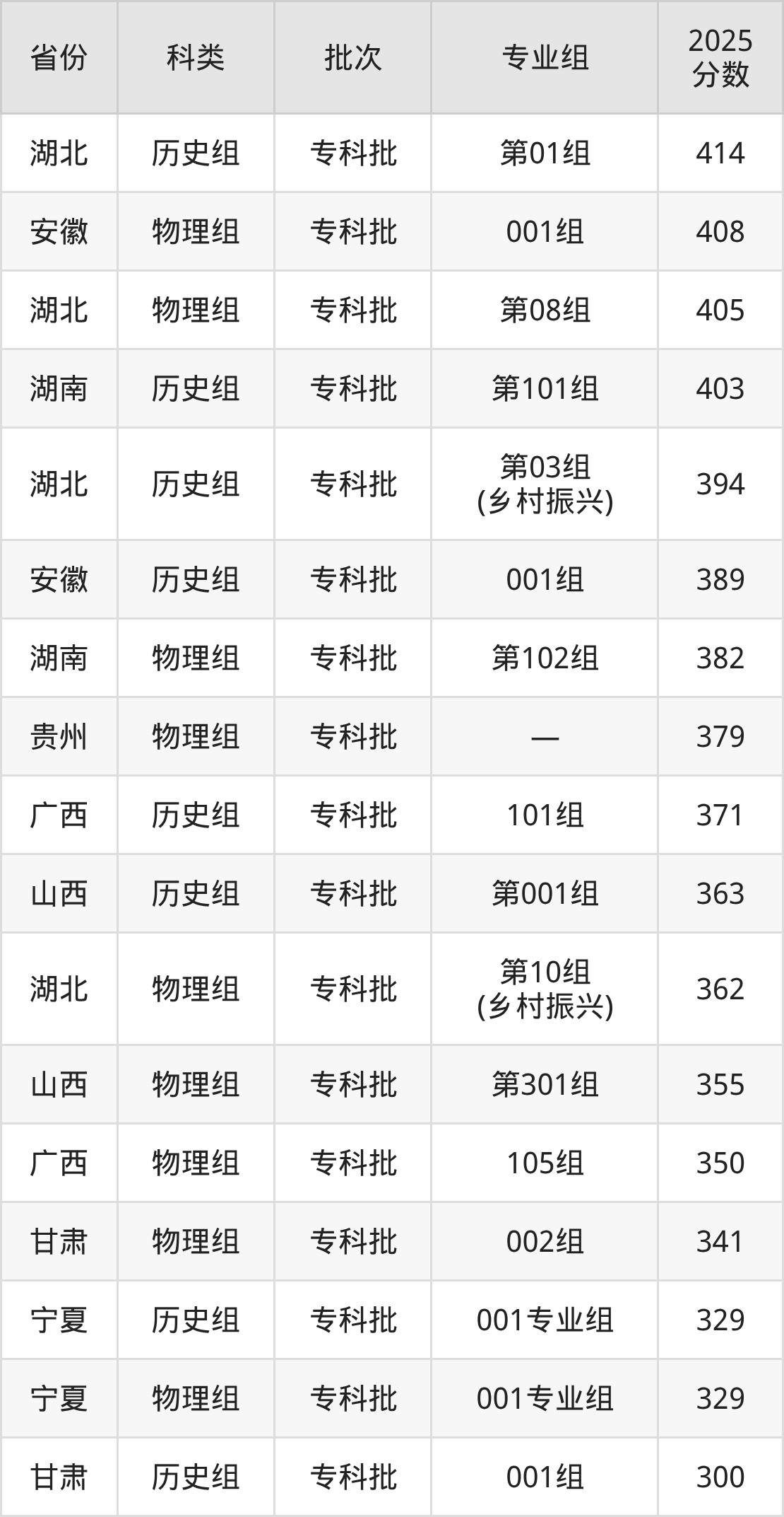 长江职业学院2026年录取分数需在高招结束官方数据公布后更新,2026届有意向报考该校的同学,可以在填报志愿时参考长江职业学院2025年录取分数线: